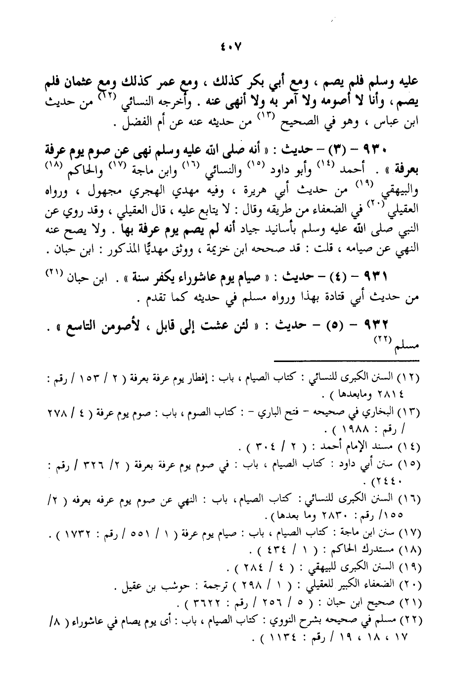 930 - (3) - حَدِيثُ: «أَنَّهُ - صَلَّى اللَّهُ عَلَيْهِ وَسَلَّمَ - نَهَى عَنْ صَوْمِ يَوْمِ عَرَفَةَ بِعَرَفَةَ» . أَحْمَدُ وَأَبُو دَاوُد وَالنَّسَائِيُّ وَابْنُ مَاجَهْ وَالْحَاكِمُ وَالْبَيْهَقِيُّ مِنْ حَدِيثِ أَبِي هُرَيْرَةَ، وَفِيهِ مَهْدِيٌّ الْهِجْرِيُّ مَجْهُولٌ، وَرَوَاهُ الْعُقَيْلِيُّ فِي الضُّعَفَاءِ مِنْ طَرِيقِهِ وَقَالَ: لَا يُتَابِعُ عَلَيْهِ، قَالَ الْعُقَيْلِيُّ، وَقَدْ رُوِيَ عَنْ النَّبِيِّ - صَلَّى اللَّهُ عَلَيْهِ وَسَلَّمَ - بِأَسَانِيدَ جِيَادٍ «أَنَّهُ لَمْ يَصُمْ يَوْمَ عَرَفَةَ بِهَا» . وَلَا يَصِحُّ عَنْهُ النَّهْيُ عَنْ صِيَامِهِ، قُلْت: قَدْ صَحَّحَهُ ابْنُ خُزَيْمَةَ، وَوَثَّقَ مَهْدِيًّا الْمَذْكُورَ: ابْنُ حِبَّانَ.