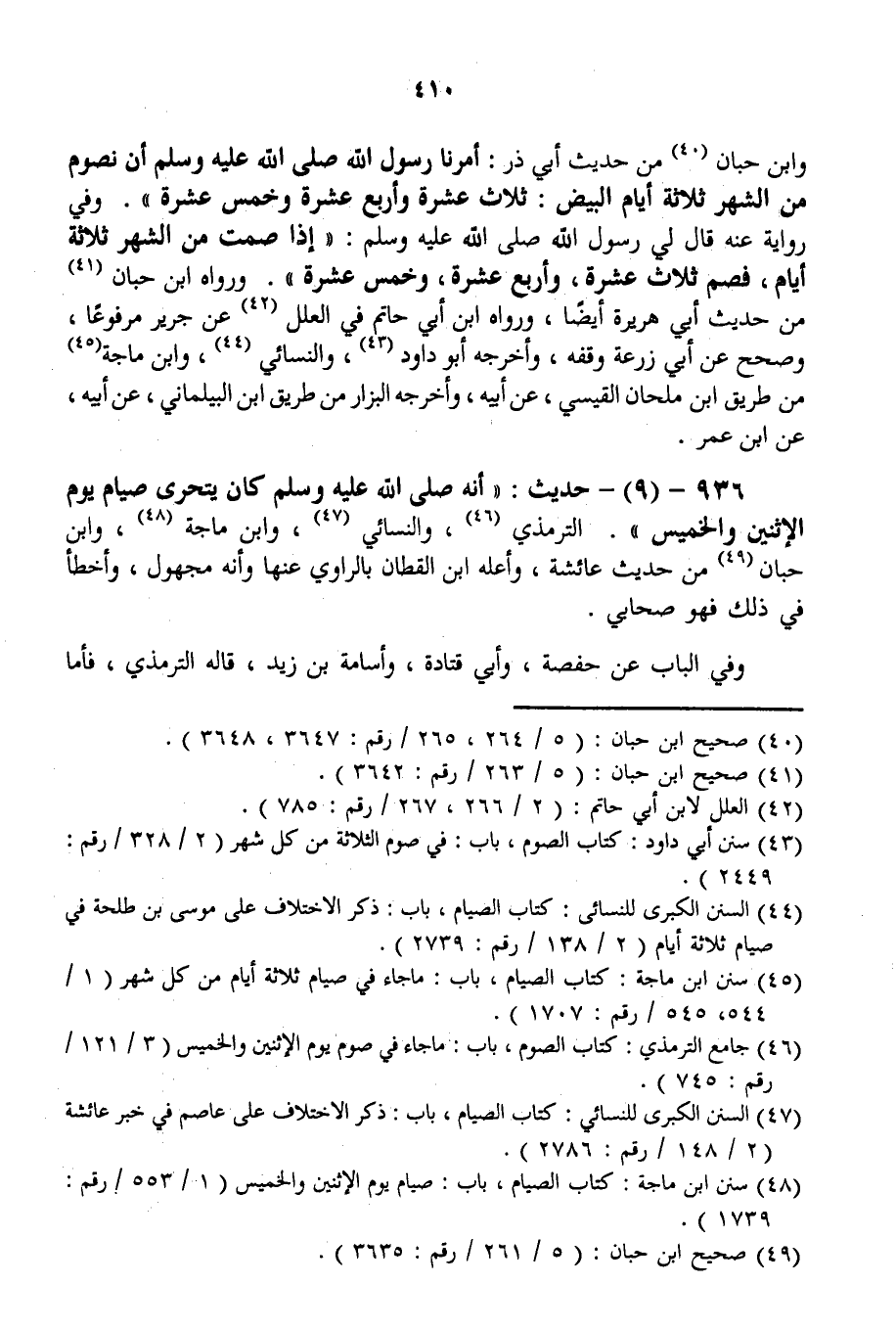 936 - (9) - حَدِيثُ: «أَنَّهُ - صَلَّى اللَّهُ عَلَيْهِ وَسَلَّمَ - كَانَ يَتَحَرَّى صِيَامَ يَوْمِ الِاثْنَيْنِ وَالْخَمِيسِ» . التِّرْمِذِيُّ، وَالنَّسَائِيُّ، وَابْنُ مَاجَهْ، وَابْنُ حِبَّانَ مِنْ حَدِيثِ عَائِشَةَ، وَأَعَلَّهُ ابْنُ الْقَطَّانِ بِالرَّاوِي عَنْهَا وَأَنَّهُ مَجْهُولٌ، وَأَخْطَأَ فِي ذَلِكَ فَهُوَ صَحَابِيٌّ. وَفِي الْبَابِ عَنْ حَفْصَةَ، وَأَبِي قَتَادَةَ، وَأُسَامَةَ بْنِ زَيْدٍ، قَالَهُ التِّرْمِذِيُّ، فَأَمَّا