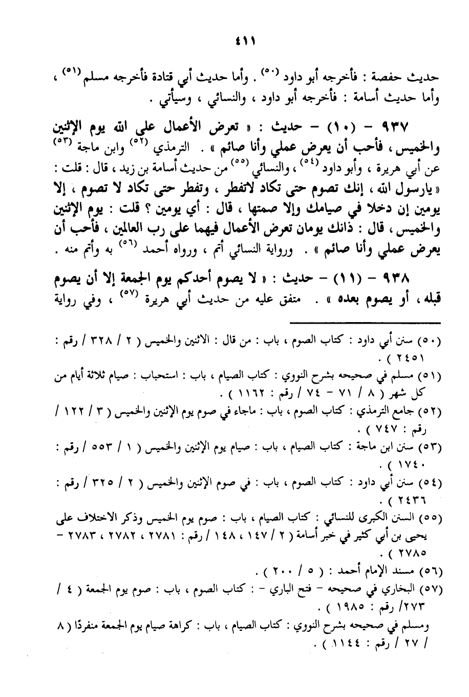 937 - (10) - حَدِيثُ: «تُعْرَضُ الْأَعْمَالُ عَلَى اللَّهِ يَوْمَ الِاثْنَيْنِ وَالْخَمِيسِ، فَأُحِبُّ أَنْ يُعْرَضَ عَمَلِي وَأَنَا صَائِمٌ» . التِّرْمِذِيُّ وَابْنُ مَاجَهْ عَنْ أَبِي هُرَيْرَةَ، وَأَبُو دَاوُد، وَالنَّسَائِيُّ مِنْ حَدِيثِ أُسَامَةَ بْنِ زَيْدٍ، قَالَ: قُلْت: «يَا رَسُولَ اللَّهِ، إنَّك تَصُومُ حَتَّى تَكَادَ لَا تُفْطِرُ، وَتُفْطِرُ حَتَّى تَكَادَ لَا تَصُومُ، إلَّا يَوْمَيْنِ إنْ دَخَلَا فِي صِيَامِك وَإِلَّا صُمْتهَا، قَالَ: أَيُّ يَوْمَيْنِ؟ قُلْت: يَوْمُ الِاثْنَيْنِ وَالْخَمِيسِ، قَالَ: ذَانِكَ يَوْمَانِ تُعْرَضُ الْأَعْمَالُ فِيهِمَا عَلَى رَبِّ الْعَالَمِينَ، فَأُحِبُّ أَنْ يُعْرَضَ عَمَلِي وَأَنَا صَائِمٌ» . وَرِوَايَةُ النَّسَائِيّ أَتَمُّ، وَرَوَاهُ أَحْمَدُ بِهِ وَأَتَمُّ مِنْهُ.