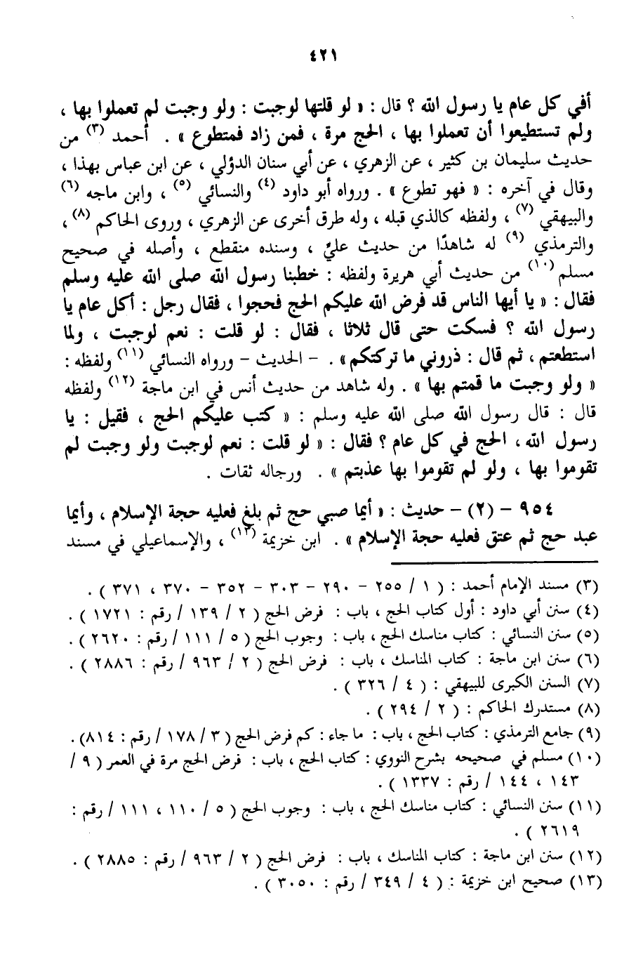 أَفِي كُلِّ عَامٍ يَا رَسُولَ اللَّهِ؟ قَالَ: لَوْ قُلْتهَا لَوَجَبَتْ: وَلَوْ وَجَبَتْ لَمْ تَعْمَلُوا بِهَا، وَلَمْ تَسْتَطِيعُوا أَنْ تَعْمَلُوا بِهَا، الْحَجُّ مَرَّةٌ، فَمَنْ زَادَ فَمُتَطَوِّعٌ» . أَحْمَدُ مِنْ حَدِيثِ سُلَيْمَانَ بْنِ كَثِيرٍ، عَنْ الزُّهْرِيِّ، عَنْ أَبِي سِنَانٍ الدُّؤَلِيِّ، عَنْ ابْنِ عَبَّاسٍ بِهَذَا، وَقَالَ فِي آخِرِهِ: «فَهُوَ تَطَوُّعٌ» . وَرَوَاهُ أَبُو دَاوُد وَالنَّسَائِيُّ، وَابْنُ مَاجَهْ وَالْبَيْهَقِيُّ، وَلَفْظُهُ كَاَلَّذِي قَبْلَهُ، وَلَهُ طُرُقٌ أُخْرَى عَنْ الزُّهْرِيِّ.