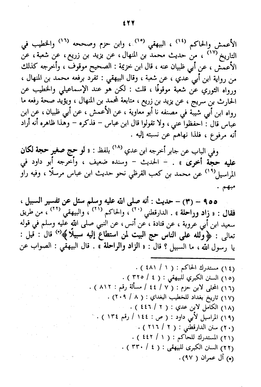 955 - (3) - حَدِيثُ: «أَنَّهُ - صَلَّى اللَّهُ عَلَيْهِ وَسَلَّمَ - سُئِلَ عَنْ تَفْسِيرِ السَّبِيلِ، فَقَالَ: زَادٌ وَرَاحِلَةٌ» . الدَّارَقُطْنِيُّ، وَالْحَاكِمُ، وَالْبَيْهَقِيُّ، مِنْ طَرِيقِ سَعِيدِ بْنِ أَبِي عَرُوبَةَ، عَنْ قَتَادَةَ، عَنْ أَنَسٍ، «عَنْ النَّبِيِّ - صَلَّى اللَّهُ عَلَيْهِ وَسَلَّمَ - فِي قَوْله تَعَالَى: {وَلِلَّهِ عَلَى النَّاسِ حِجُّ الْبَيْتِ مَنِ اسْتَطَاعَ إِلَيْهِ سَبِيلا} [آل عمران: 97] قَالَ: قِيلَ: يَا رَسُولَ اللَّهِ، مَا السَّبِيلُ؟ قَالَ: الزَّادُ وَالرَّاحِلَةُ» . قَالَ الْبَيْهَقِيُّ: الصَّوَابُ عَنْ