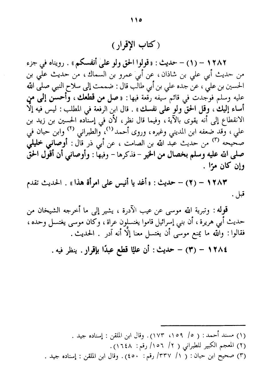 (كِتَابُ الْإِقْرَارِ) 1282 - (1) حَدِيثُ: «قُولُوا الْحَقَّ وَلَوْ عَلَى أَنْفُسِكُمْ» . رَوَيْنَاهُ فِي جُزْءٍ مِنْ حَدِيثِ أَبِي عَلِيِّ بْنِ شَاذَانَ، عَنْ أَبِي عَمْرِو بْنِ السَّمَّاكِ، مِنْ حَدِيثِ عَلِيِّ بْنِ الْحُسَيْنِ بْنِ عَلِيٍّ، عَنْ جَدِّهِ عَلِيِّ بْنِ أَبِي طَالِبٍ قَالَ: «ضَمَمْت إلَى سِلَاحِ النَّبِيِّ - صَلَّى اللَّهُ عَلَيْهِ وَسَلَّمَ - فَوَجَدْت فِي قَائِمِ سَيْفِهِ رَقْعَةً فِيهَا: صِلْ مَنْ قَطَعَك، وَأَحْسِنْ إلَى مَنْ أَسَاءَ إلَيْك، وَقُلْ الْحَقَّ وَلَوْ عَلَى نَفْسِك» . قَالَ ابْنُ الرِّفْعَةِ فِي الْمَطْلَبِ: لَيْسَ فِيهِ إلَّا الِانْقِطَاعُ إلَى أَنَّهُ يَقْوَى بِالْآيَةِ، وَفِيمَا قَالَ نَظَرٌ، لِأَنَّ فِي إسْنَادِهِ الْحُسَيْنَ بْنَ زَيْدِ بْنِ عَلِيٍّ، وَقَدْ ضَعَّفَهُ ابْنُ الْمَدِينِيِّ وَغَيْرُهُ.
