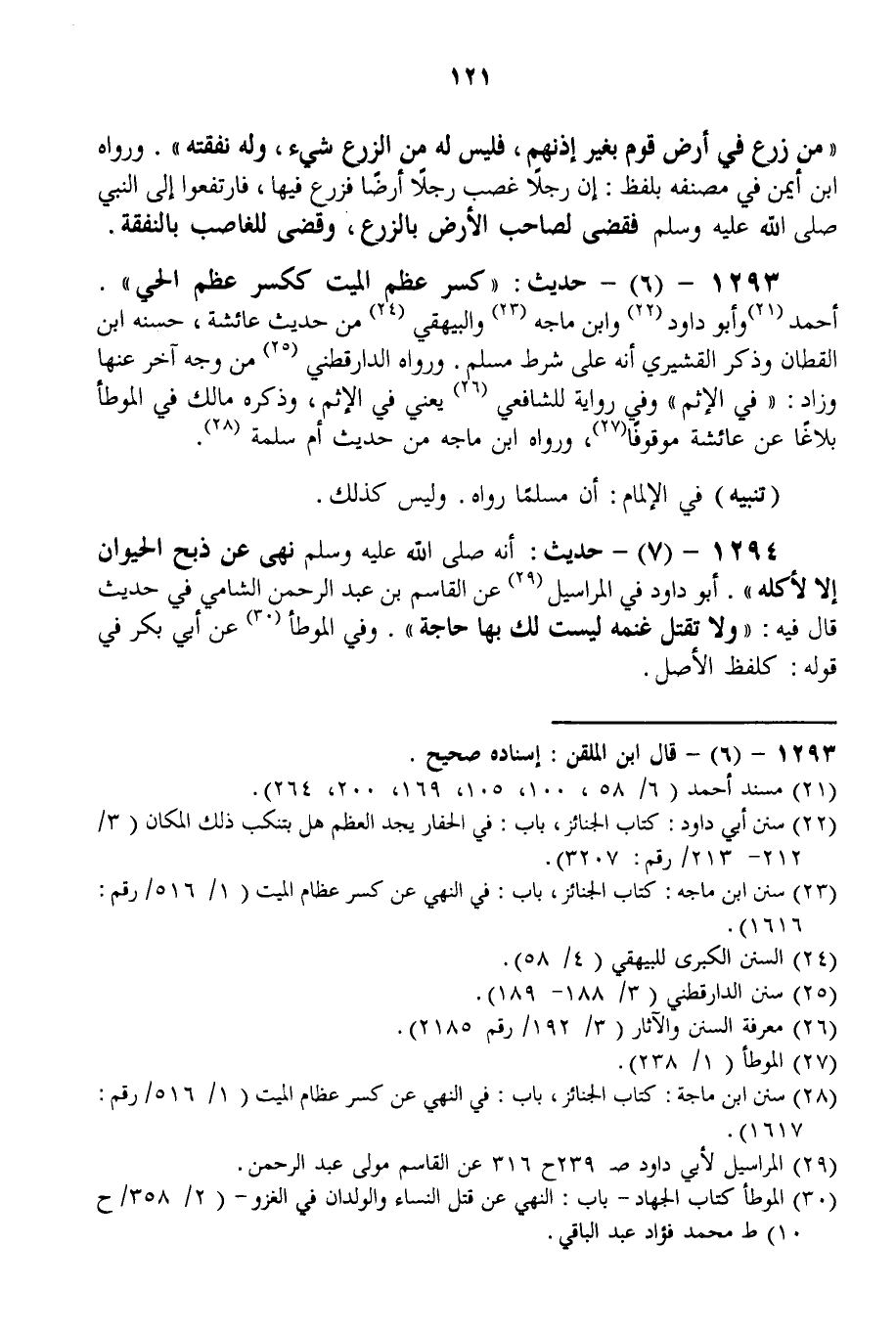 1293 - (6) حَدِيثُ: «كَسْرُ عَظْمِ الْمَيِّتِ كَكَسْرِ عَظْمِ الْحَيِّ» . أَحْمَدُ وَأَبُو دَاوُد وَابْنُ مَاجَهْ وَالْبَيْهَقِيُّ مِنْ حَدِيثِ عَائِشَةَ، حَسَّنَهُ ابْنُ الْقَطَّانِ وَذَكَرَ الْقُشَيْرِيُّ أَنَّهُ عَلَى شَرْطِ مُسْلِمٍ. وَرَوَاهُ الدَّارَقُطْنِيُّ مِنْ وَجْهٍ آخَرَ عَنْهَا وَزَادَ: «فِي الْإِثْمِ» وَفِي رِوَايَةٍ لِلشَّافِعِيِّ يَعْنِي فِي الْإِثْمِ، وَذَكَرَهُ مَالِكٌ فِي الْمُوَطَّأِ بَلَاغًا عَنْ عَائِشَةَ مَوْقُوفًا، وَرَوَاهُ ابْنُ مَاجَهْ مِنْ حَدِيثِ أُمِّ سَلَمَةَ.