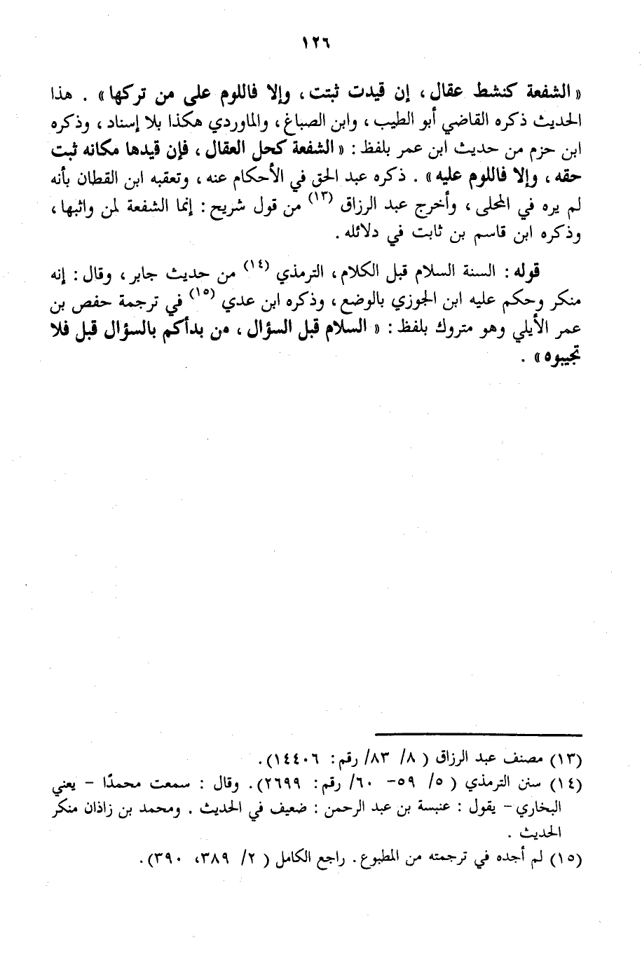 «الشُّفْعَةُ كَنَشْطِ عِقَالٍ، إنْ قُيِّدَتْ ثَبَتَتْ، وَإِلَّا فَاللَّوْمُ عَلَى مَنْ تَرَكَهَا» . هَذَا الْحَدِيثُ ذَكَرَهُ الْقَاضِي أَبُو الطَّيِّبِ، وَابْنُ الصَّبَّاغِ، وَالْمَاوَرْدِيُّ هَكَذَا بِلَا إسْنَادٍ، وَذَكَرَهُ ابْنُ حَزْمٍ مِنْ حَدِيثِ ابْنِ عُمَرَ بِلَفْظِ: «الشُّفْعَةُ كَحَلِّ الْعِقَالِ، فَإِنْ قَيَّدَهَا مَكَانَهُ ثَبَتَ حَقُّهُ، وَإِلَّا فَاللَّوْمُ عَلَيْهِ» . ذَكَرَهُ عَبْدُ الْحَقِّ فِي الْأَحْكَامِ عَنْهُ، وَتَعَقَّبَهُ ابْنُ الْقَطَّانِ بِأَنَّهُ لَمْ يَرَهُ فِي الْمُحَلَّى، وَأَخْرَجَ عَبْدُ الرَّزَّاقِ مِنْ قَوْلِ شُرَيْحٍ: «إنَّمَا الشُّفْعَةُ لِمَنْ وَاثَبَهَا» ، وَذَكَرَهُ ابْنُ قَاسِمِ بْنِ ثَابِتٍ فِي دَلَائِلِهِ.