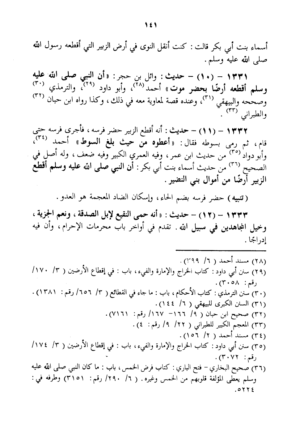 1332 - (11) - حَدِيثٌ: «أَنَّهُ أَقْطَعَ الزُّبَيْرَ حُضْرَ فَرَسِهِ، فَأَجْرَى فَرَسَهُ حَتَّى قَامَ، ثُمَّ رَمَى بِسَوْطِهِ فَقَالَ: أَعْطُوهُ مِنْ حَيْثُ بَلَغَ السَّوْطُ» أَحْمَدُ، وَأَبُو دَاوُد مِنْ حَدِيثِ ابْنِ عُمَرَ، وَفِيهِ الْعُمَرِيُّ الْكَبِيرُ وَفِيهِ ضَعْفٌ، وَلَهُ أَصْلٌ فِي الصَّحِيحِ مِنْ حَدِيثِ أَسْمَاءَ بِنْتِ أَبِي بَكْرٍ: «أَنَّ النَّبِيَّ - صَلَّى اللَّهُ عَلَيْهِ وَسَلَّمَ - أَقْطَعَ الزُّبَيْرَ أَرْضًا مِنْ أَمْوَالِ بَنِي النَّضِيرِ» .