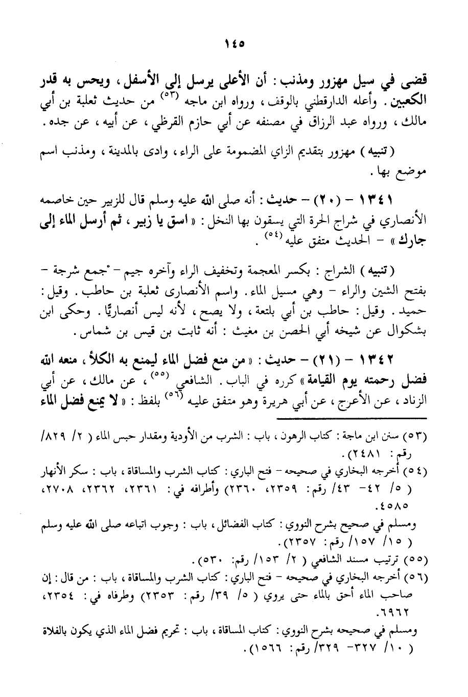 1341 - (20) حَدِيثُ: «أَنَّهُ - صَلَّى اللَّهُ عَلَيْهِ وَسَلَّمَ - قَالَ لِلزُّبَيْرِ حِينَ خَاصَمَهُ الْأَنْصَارِيُّ فِي شِرَاجِ الْحَرَّةِ الَّتِي يَسْقُونَ بِهَا النَّخْلَ: اسْقِ يَا زُبَيْرُ، ثُمَّ أَرْسِلْ الْمَاءَ إلَى جَارِكَ» - الْحَدِيثُ مُتَّفَقٌ عَلَيْهِ.