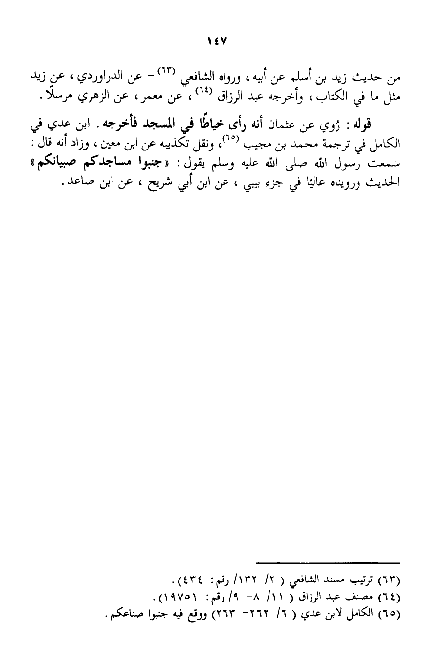 قَوْلُهُ: رُوِيَ عَنْ عُثْمَانَ أَنَّهُ رَأَى خَيَّاطًا فِي الْمَسْجِدِ فَأَخْرَجَهُ. ابْنُ عَدِيٍّ فِي الْكَامِلِ فِي تَرْجَمَةِ مُحَمَّدِ بْنِ مُجِيبٍ، وَنُقِلَ تَكْذِيبُهُ عَنْ ابْنِ مَعِينٍ، وَزَادَ أَنَّهُ قَالَ: «سَمِعْت رَسُولَ اللَّهِ - صَلَّى اللَّهُ عَلَيْهِ وَسَلَّمَ - يَقُولُ: جَنِّبُوا مَسَاجِدَكُمْ صِبْيَانَكُمْ» الْحَدِيثَ وَرَوَيْنَاهُ عَالِيًا فِي جُزْأَيْنِ، عَنْ ابْنِ أَبِي شُرَيْحٍ، عَنْ ابْنِ صَاعِدٍ.
