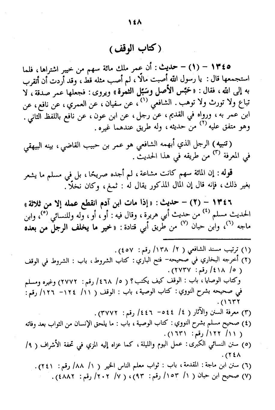 1345 - (1) حَدِيثُ: «أَنَّ عُمَرَ مَلَكَ مِائَةَ سَهْمٍ مِنْ خَيْبَرَ اشْتَرَاهَا، فَلَمَّا اسْتَجْمَعَهَا قَالَ: يَا رَسُولَ اللَّهِ أَصَبْت مَالًا، لَمْ أُصِبْ مِثْلَهُ قَطُّ، وَقَدْ أَرَدْت أَنْ أَتَقَرَّبَ بِهِ إلَى اللَّهِ، فَقَالَ: أَحْبِسْ الْأَصْلَ وَسَبِّلْ الثَّمَرَةَ» وَيُرْوَى: «فَجَعَلَهَا عُمَرُ صَدَقَةً، لَا تُبَاعُ وَلَا تُورَثُ وَلَا تُوهَبُ» . الشَّافِعِيُّ، عَنْ سُفْيَانَ، عَنْ الْعُمْرِيِّ، عَنْ نَافِعٍ، عَنْ ابْنِ عُمَرَ بِهِ، وَرَوَاهُ فِي الْقَدِيمِ، عَنْ رَجُلٍ، عَنْ ابْنِ عَوْنٍ، عَنْ نَافِعٍ بِاللَّفْظِ الثَّانِي. وَهُوَ مُتَّفَقٌ عَلَيْهِ مِنْ حَدِيثِهِ، وَلَهُ طَرِيقٌ عِنْدَهُمَا غَيْرُهُ.