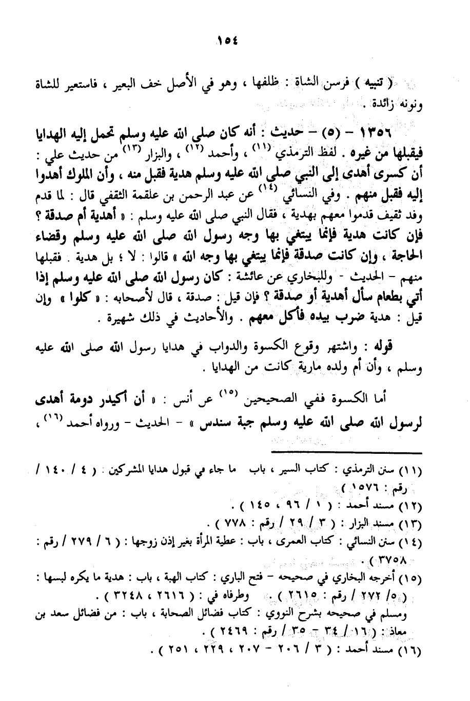 1356 - (5) - حَدِيثُ: «أَنَّهُ كَانَ - صَلَّى اللَّهُ عَلَيْهِ وَسَلَّمَ - تُحْمَلُ إلَيْهِ الْهَدَايَا فَيَقْبَلُهَا مِنْ غَيْرِهِ» . لَفْظُ التِّرْمِذِيِّ، وَأَحْمَدَ، وَالْبَزَّارِ مِنْ حَدِيثِ عَلِيٍّ: «أَنَّ كِسْرَى أَهْدَى إلَى النَّبِيِّ - صَلَّى اللَّهُ عَلَيْهِ وَسَلَّمَ - هَدِيَّةً فَقَبِلَ مِنْهُ، وَأَنَّ الْمُلُوكَ أَهْدَوْا إلَيْهِ فَقَبِلَ مِنْهُمْ» . وَفِي النَّسَائِيّ عَنْ عَبْدِ الرَّحْمَنِ بْنِ عَلْقَمَةَ الثَّقَفِيِّ قَالَ: «لَمَّا قَدِمَ وَفْدُ ثَقِيفٍ قَدِمُوا مَعَهُمْ بِهَدِيَّةٍ، فَقَالَ النَّبِيُّ - صَلَّى اللَّهُ عَلَيْهِ وَسَلَّمَ -: أَهَدِيَّةٌ أَمْ صَدَقَةٌ؟ فَإِنْ كَانَتْ هَدِيَّةً فَإِنَّمَا يُبْتَغَى بِهَا وَجْهُ رَسُولِ اللَّهِ - صَلَّى اللَّهُ عَلَيْهِ وَسَلَّمَ - وَقَضَاءُ الْحَاجَةِ، وَإِنْ كَانَتْ صَدَقَةً فَإِنَّمَا يُبْتَغَى بِهَا وَجْهُ اللَّهِ قَالُوا: لَا؛ بَلْ هَدِيَّةٌ. فَقَبِلَهَا مِنْهُمْ» - الْحَدِيثَ - وَلِلْبُخَارِيِّ عَنْ عَائِشَةَ: «كَانَ رَسُولُ اللَّهِ - صَلَّى اللَّهُ عَلَيْهِ وَسَلَّمَ - إذَا أُتِيَ بِطَعَامٍ سَأَلَ أَهَدِيَّةٌ أَوْ صَدَقَةٌ؟ فَإِنْ قِيلَ: صَدَقَةٌ، قَالَ لِأَصْحَابِهِ: كُلُوا. وَإِنْ قِيلَ: هَدِيَّةٌ ضَرَبَ بِيَدِهِ فَأَكَلَ مَعَهُمْ» . وَالْأَحَادِيثُ فِي ذَلِكَ شَهِيرَةٌ.
