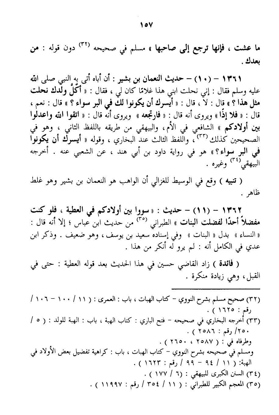 1361 - (10) - حَدِيثُ النُّعْمَانِ بْنِ بَشِيرٍ: «أَنَّ أَبَاهُ أَتَى بِهِ النَّبِيَّ - صَلَّى اللَّهُ عَلَيْهِ وَسَلَّمَ - فَقَالَ: إنِّي نَحَلْت ابْنِي هَذَا غُلَامًا كَانَ لِي، فَقَالَ: أَكُلُّ وَلَدِك نَحَلْت مِثْلَ هَذَا؟ قَالَ: لَا، قَالَ: أَيَسُرُّك أَنْ يَكُونُوا لَك فِي الْبِرِّ سَوَاءً؟ قَالَ: نَعَمْ، قَالَ: فَلَا إذًا» وَيُرْوَى أَنَّهُ قَالَ: «فَارْتَجِعْهُ» وَيُرْوَى أَنَّهُ قَالَ: «اتَّقُوا اللَّهَ وَاعْدِلُوا بَيْنَ أَوْلَادِكُمْ» الشَّافِعِيُّ فِي الْأُمِّ، وَالْبَيْهَقِيُّ مِنْ طَرِيقِهِ بِاللَّفْظِ الثَّانِي، وَهُوَ فِي الصَّحِيحَيْنِ كَذَلِكَ، وَاللَّفْظُ الثَّالِثُ عِنْدَ الْبُخَارِيِّ، وَقَوْلُهُ «أَيَسُرُّك أَنْ يَكُونُوا فِي الْبِرِّ سَوَاءً؟» هُوَ فِي رِوَايَةِ دَاوُد بْنِ أَبِي هِنْدٍ، عَنْ الشَّعْبِيِّ عَنْهُ. أَخْرَجَهُ الْبَيْهَقِيُّ وَغَيْرُهُ