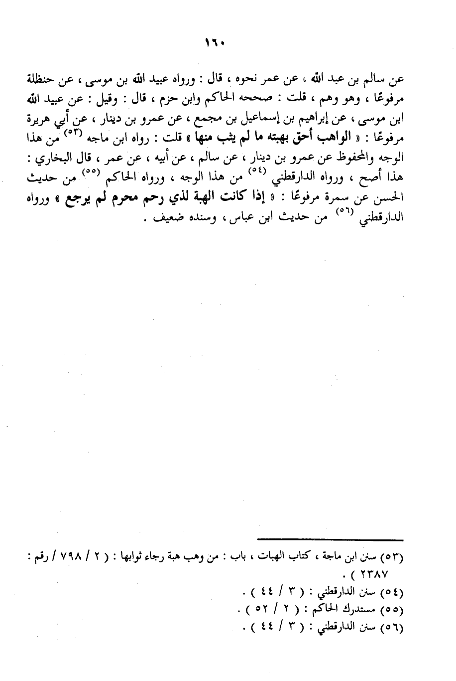 عَنْ سَالِمِ بْنِ عَبْدِ اللَّهِ، عَنْ عُمَرَ نَحْوَهُ، قَالَ: وَرَوَاهُ عُبَيْدُ اللَّهِ بْنُ مُوسَى، عَنْ حَنْظَلَةَ مَرْفُوعًا، وَهُوَ وَهْمٌ، قُلْت: صَحَّحَهُ الْحَاكِمُ وَابْنُ حَزْمٍ، قَالَ: وَقِيلَ: عَنْ عُبَيْدِ اللَّهِ بْنِ مُوسَى، عَنْ إبْرَاهِيمَ بْنِ إسْمَاعِيلَ بْنِ مُجَمِّعٍ، عَنْ عَمْرِو بْنِ دِينَارٍ، عَنْ أَبِي هُرَيْرَةَ مَرْفُوعًا: «الْوَاهِبُ أَحَقُّ بِهِبَتِهِ مَا لَمْ يَثِبْ مِنْهَا» قُلْت: رَوَاهُ ابْنُ مَاجَهْ مِنْ هَذَا الْوَجْهِ وَالْمَحْفُوظُ عَنْ عَمْرِو بْنِ دِينَارٍ، عَنْ سَالِمٍ، عَنْ أَبِيهِ، عَنْ عُمَرَ، قَالَ الْبُخَارِيُّ: هَذَا أَصَحُّ، وَرَوَاهُ الدَّارَقُطْنِيُّ مِنْ هَذَا الْوَجْهِ، وَرَوَاهُ الْحَاكِمُ مِنْ حَدِيثِ الْحَسَنِ عَنْ سَمُرَةَ مَرْفُوعًا: «إذَا كَانَتْ الْهِبَةُ لِذِي رَحِمٍ مَحْرَمٍ لَمْ يَرْجِعْ» وَرَوَاهُ الدَّارَقُطْنِيُّ مِنْ حَدِيثِ ابْنِ عَبَّاسٍ، وَسَنَدُهُ ضَعِيفٌ.