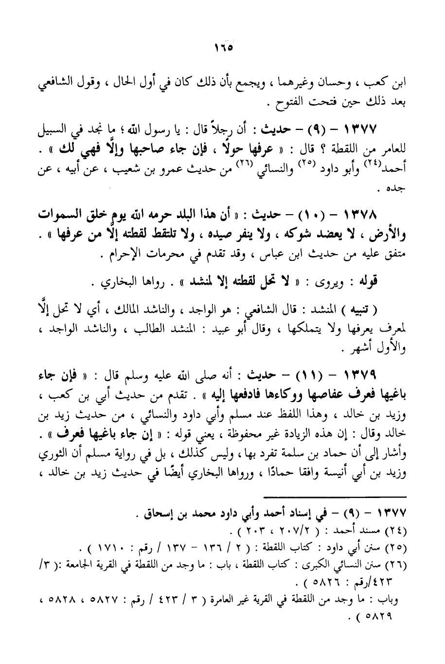 1377 - (9) - حَدِيثُ: «أَنَّ رَجُلًا قَالَ: يَا رَسُولَ اللَّهِ؛ مَا نَجِدُ فِي السَّبِيلِ لِلْعَامِرِ مِنْ اللُّقَطَةِ؟ قَالَ: عَرِّفْهَا حَوْلًا، فَإِنْ جَاءَ صَاحِبُهَا وَإِلَّا فَهِيَ لَك» . أَحْمَدُ وَأَبُو دَاوُد وَالنَّسَائِيُّ مِنْ حَدِيثِ عَمْرِو بْنِ شُعَيْبٍ، عَنْ أَبِيهِ، عَنْ جَدِّهِ.