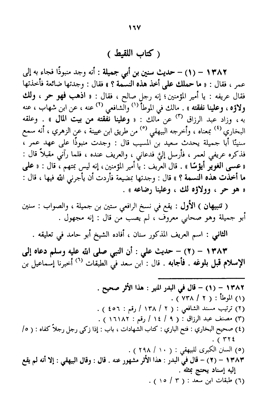1382 - (1) - حَدِيثُ سُنَيْنِ بْنِ أَبِي جَمِيلَةَ: أَنَّهُ وَجَدَ مَنْبُوذًا فَجَاءَ بِهِ إلَى عُمَرَ، فَقَالَ: " مَا حَمَلَك عَلَى أَخْذِ هَذِهِ النَّسَمَةِ؟ " فَقَالَ: وَجَدْتهَا ضَائِعَةً فَأَخَذْتهَا فَقَالَ عَرِيفُهُ: يَا أَمِيرَ الْمُؤْمِنِينَ؛ إنَّهُ رَجُلٌ صَالِحٌ، فَقَالَ: " اذْهَبْ فَهُوَ حُرٌّ، وَلَك وَلَاؤُهُ، وَعَلَيْنَا نَفَقَتُهُ. مَالِكٌ فِي الْمُوَطَّأِ وَالشَّافِعِيُّ عَنْهُ، عَنْ ابْنِ شِهَابٍ، عَنْهُ بِهِ، وَزَادَ عَبْدُ الرَّزَّاقِ عَنْ مَالِكٍ: " وَعَلَيْنَا نَفَقَتُهُ مِنْ بَيْتِ الْمَالِ. وَعَلَّقَهُ الْبُخَارِيُّ بِمَعْنَاهُ، وَأَخْرَجَهُ الْبَيْهَقِيُّ مِنْ طَرِيقِ ابْنِ عُيَيْنَةَ، عَنْ الزُّهْرِيِّ، أَنَّهُ سَمِعَ سُنَيْنًا أَبَا جَمِيلَةَ يُحَدِّثُ سَعِيدَ بْنَ الْمُسَيِّبِ قَالَ: وَجَدْت مَنْبُوذًا عَلَى عَهْدِ عُمَرَ، فَذَكَرَهُ عَرِيفِي لِعُمَرَ، فَأَرْسَلَا لِي فَدَعَانِي، وَالْعَرِيفُ عِنْدَهُ، فَلَمَّا رَآنِي مُقْبِلًا قَالَ: " عَسَى الْغُوَيْرُ أَبْؤُسًا ". قَالَ الْعَرِيفُ: يَا أَمِيرَ الْمُؤْمِنِينَ. إنَّهُ لَيْسَ بِمُتَّهَمٍ، قَالَ: " عَلَى مَا أَخَذْت هَذِهِ النَّسَمَةَ؟ " قَالَ: وَجَدْتهَا بِمَضْيَعَةٍ فَأَرَدْت أَنْ يَأْجُرَنِي اللَّهُ فِيهَا، قَالَ: " هُوَ حُرٌّ، وَوَلَاؤُهُ لَك، وَعَلَيْنَا رَضَاعُهُ.
