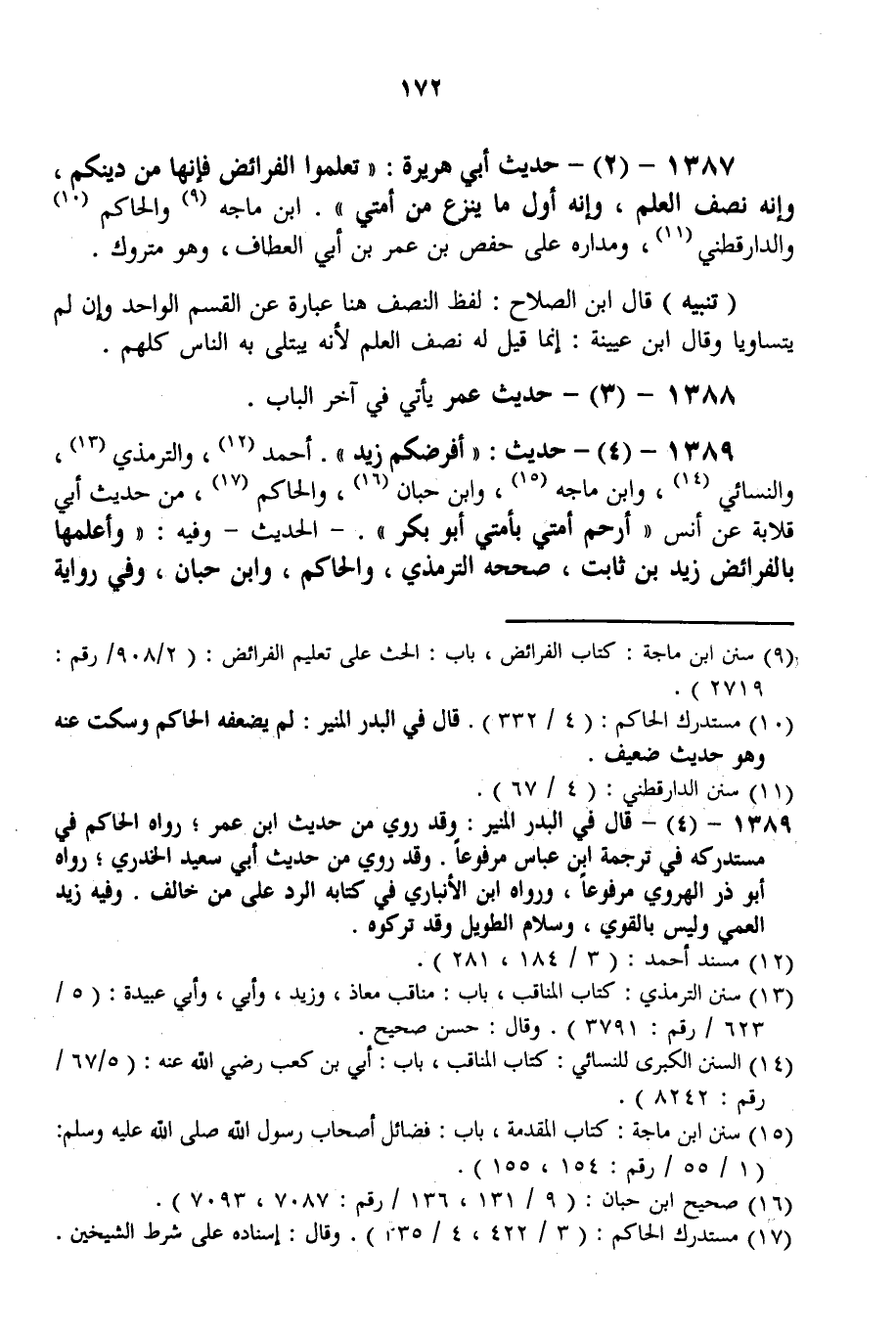 50 - 1387 - (2) - حَدِيثُ أَبِي هُرَيْرَةَ: «تَعَلَّمُوا الْفَرَائِضَ فَإِنَّهَا مِنْ دِينِكُمْ، وَإِنَّهُ نِصْفُ الْعِلْمِ، وَإِنَّهُ أَوَّلُ مَا يُنْزَعُ مِنْ أُمَّتِي» . ابْنُ مَاجَهْ وَالْحَاكِمُ وَالدَّارَقُطْنِيّ، وَمَدَارُهُ عَلَى حَفْصِ بْنِ عُمَرَ بْنِ أَبِي الْعَطَّافِ، وَهُوَ مَتْرُوكٌ.