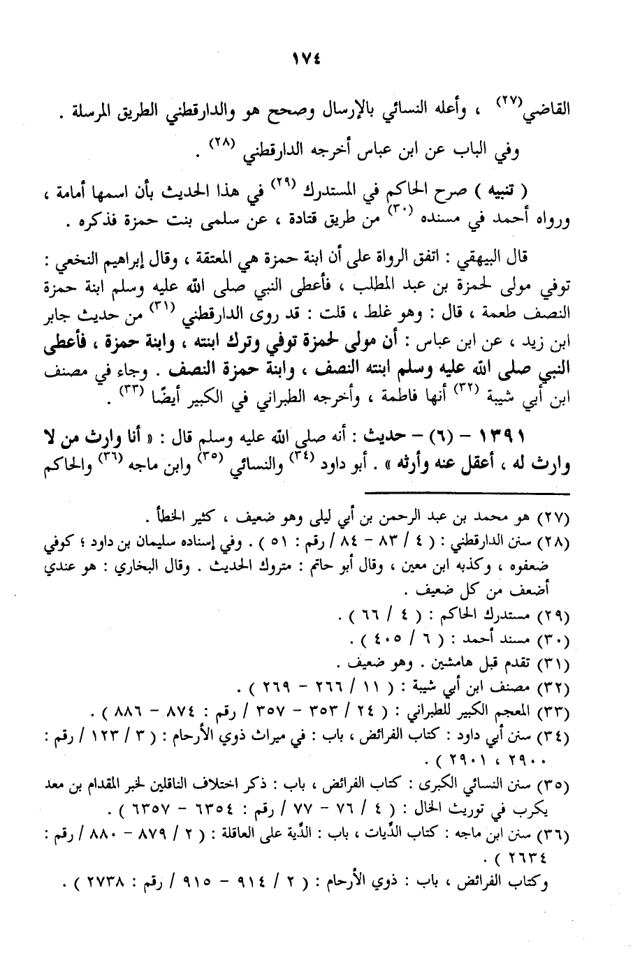 1391 - (6) - حَدِيثُ: أَنَّهُ - صَلَّى اللَّهُ عَلَيْهِ وَسَلَّمَ - قَالَ: «أَنَا وَارِثُ مَنْ لَا وَارِثَ لَهُ، أَعْقِلُ عَنْهُ وَأَرِثُهُ» . أَبُو دَاوُد وَالنَّسَائِيُّ وَابْنُ مَاجَهْ وَالْحَاكِمُ