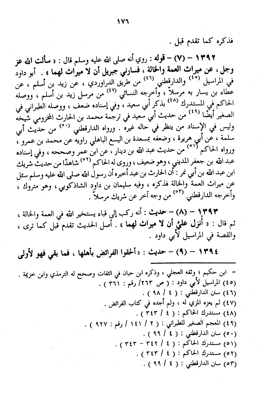 1392 - (7) - قَوْلُهُ: رُوِيَ أَنَّهُ - صَلَّى اللَّهُ عَلَيْهِ وَسَلَّمَ - قَالَ: «سَأَلْت اللَّهَ عَزَّ وَجَلَّ، عَنْ مِيرَاثِ الْعَمَّةِ وَالْخَالَةُ، فَسَارَّنِي جِبْرِيلُ أَنْ لَا مِيرَاثَ لَهُمَا» أَبُو دَاوُد فِي الْمَرَاسِيلِ وَالدَّارَقُطْنِيّ مِنْ طَرِيقِ الدَّرَاوَرْدِيِّ، عَنْ زَيْدِ بْنِ أَسْلَمَ، عَنْ عَطَاءِ بْنِ يَسَارٍ بِهِ مُرْسَلًا، وَأَخْرَجَهُ النَّسَائِيُّ مِنْ مُرْسَلِ زَيْدِ بْنِ أَسْلَمَ، وَوَصَلَهُ الْحَاكِمُ فِي الْمُسْتَدْرَكِ بِذِكْرِ أَبِي سَعِيدٍ، وَفِي إسْنَادِهِ ضَعْفٌ، وَوَصَلَهُ الطَّبَرَانِيُّ فِي الصَّغِيرِ أَيْضًا مِنْ حَدِيثِ أَبِي سَعِيدٍ فِي تَرْجَمَةِ مُحَمَّدِ بْنِ الْحَارِثِ الْمَخْزُومِيِّ شَيْخُهُ وَلَيْسَ فِي الْإِسْنَادِ مَنْ يُنْظَرُ فِي حَالِهِ غَيْرُهُ. وَرَوَاهُ الدَّارَقُطْنِيُّ مِنْ حَدِيثِ أَبِي سَلَمَةَ، عَنْ أَبِي هُرَيْرَةَ، وَضَعَّفَهُ بِمَسْعَدَةَ بْنِ الْيَسَعِ الْبَاهِلِيِّ رَاوِيهِ عَنْ مُحَمَّدِ بْنِ عَمْرٍو، وَرَوَاهُ الْحَاكِمُ مِنْ حَدِيثِ عَبْدِ اللَّهِ بْنِ دِينَارٍ، عَنْ ابْنِ عُمَرَ وَصَحَّحَهُ، وَفِي إسْنَادِهِ عَبْدُ اللَّهِ بْنُ جَعْفَرٍ الْمَدِينِيُّ، وَهُوَ ضَعِيفٌ.