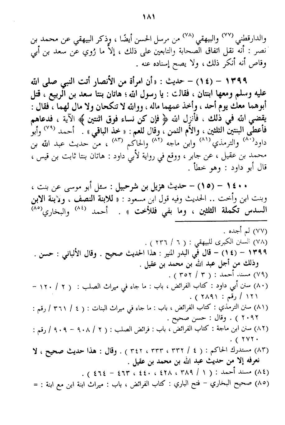 1399 - (14) - حَدِيثُ: " «أَنَّ امْرَأَةً مِنْ الْأَنْصَارِ أَتَتْ النَّبِيَّ - صَلَّى اللَّهُ عَلَيْهِ وَسَلَّمَ - وَمَعَهَا ابْنَتَانِ، فَقَالَتْ: يَا رَسُولَ اللَّهِ؛ هَاتَانِ بِنْتَا سَعْدِ بْنِ الرَّبِيعِ، قُتِلَ أَبُوهُمَا مَعَك يَوْمَ أُحُدٍ، وَأَخَذَ عَمُّهُمَا مَالَهُ، وَوَاللَّهِ لَا تُنْكَحَانِ وَلَا مَالَ لَهُمَا، فَقَالَ: يَقْضِي اللَّهُ فِي ذَلِكَ، فَأَنْزَلَ اللَّهُ {فَإِنْ كُنَّ نِسَاءً فَوْقَ اثْنَتَيْنِ} [النساء: 11] الْآيَةَ، فَدَعَاهُمْ فَأَعْطَى الْبِنْتَيْنِ الثُّلُثَيْنِ، وَالْأُمَّ الثُّمُنَ، وَقَالَ لِلْعَمِّ: خُذْ الْبَاقِيَ» . أَحْمَدُ وَأَبُو دَاوُد وَالتِّرْمِذِيُّ وَابْنُ مَاجَهْ وَالْحَاكِمُ، مِنْ حَدِيثِ عَبْدِ اللَّهِ بْنِ مُحَمَّدِ بْنِ عَقِيلٍ، عَنْ جَابِرٍ، وَوَقَعَ فِي رِوَايَةٍ لِأَبِي دَاوُد: «هَاتَانِ بِنْتَا ثَابِتِ بْنِ قَيْسٍ» ، قَالَ أَبُو دَاوُد: وَهُوَ خَطَأٌ.