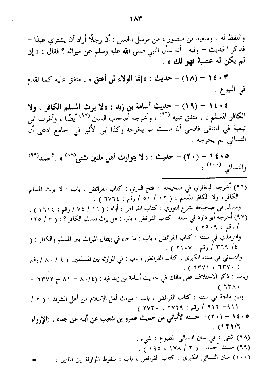 1404 - (19) - حَدِيثُ أُسَامَةَ بْنِ زَيْدٍ: «لَا يَرِثُ الْمُسْلِمُ الْكَافِرَ، وَلَا الْكَافِرُ الْمُسْلِمَ» . مُتَّفَقٌ عَلَيْهِ، وَأَخْرَجَهُ أَصْحَابُ السُّنَنِ أَيْضًا، وَأَغْرَبَ ابْنُ تَيْمِيَّةَ فِي الْمُنْتَقَى فَادَّعَى أَنَّ مُسْلِمًا لَمْ يُخْرِجْهُ وَكَذَا ابْنُ الْأَثِيرِ فِي الْجَامِعِ ادَّعَى أَنَّ النَّسَائِيَّ لَمْ يُخْرِجْهُ.