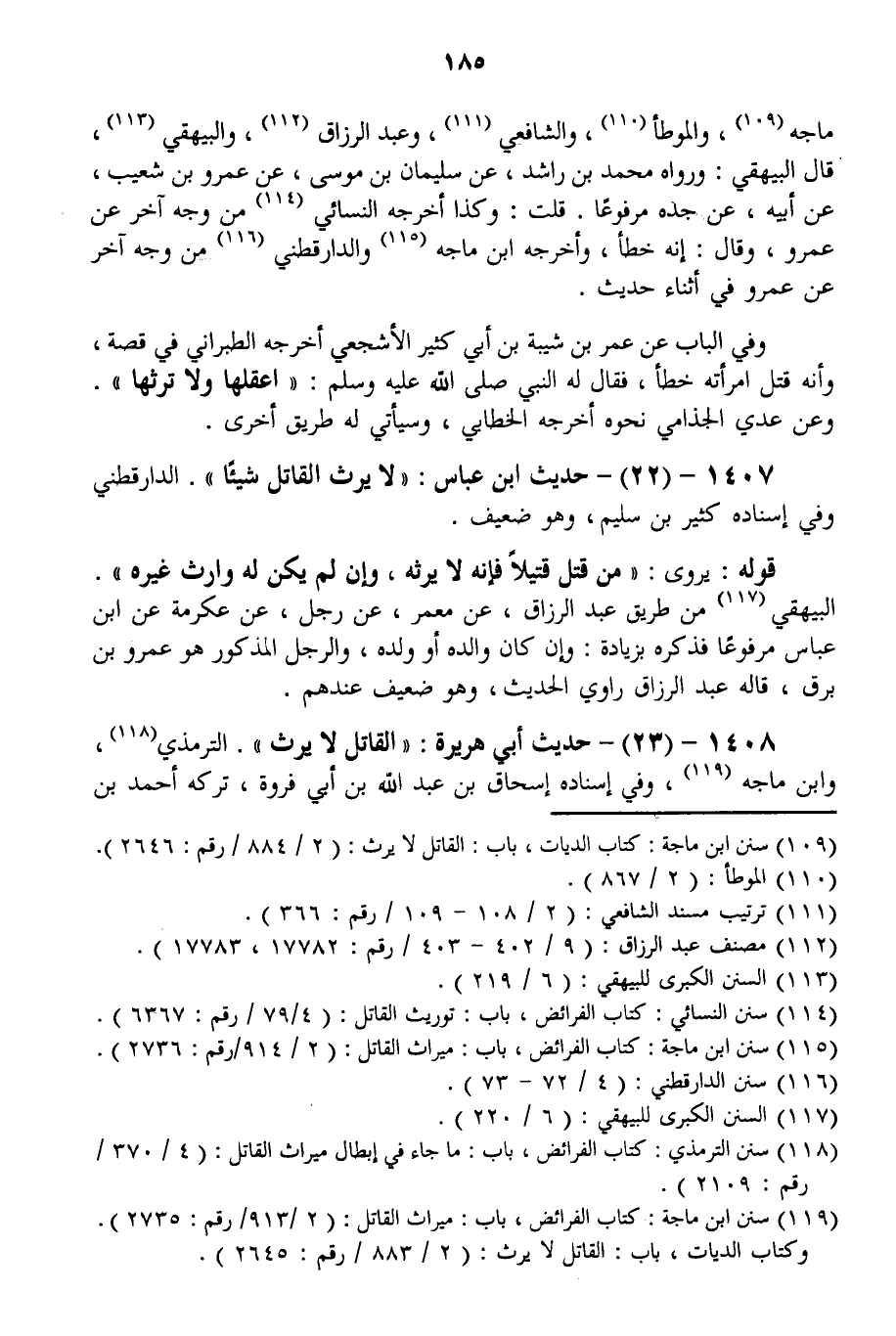 1407 - (22) - حَدِيثُ ابْنِ عَبَّاسٍ: «لَا يَرِثُ الْقَاتِلُ شَيْئًا» . الدَّارَقُطْنِيُّ وَفِي إسْنَادِهِ كَثِيرُ بْنُ سُلَيْمٍ، وَهُوَ ضَعِيفٌ. قَوْلُهُ: يُرْوَى: «مَنْ قَتَلَ قَتِيلًا فَإِنَّهُ لَا يَرِثُهُ، وَإِنْ لَمْ يَكُنْ لَهُ وَارِثٌ غَيْرُهُ» . الْبَيْهَقِيُّ مِنْ طَرِيقِ عَبْدِ الرَّزَّاقِ، عَنْ مَعْمَرٍ، عَنْ رَجُلٍ، عَنْ عِكْرِمَةَ عَنْ ابْنِ عَبَّاسٍ مَرْفُوعًا فَذَكَرَهُ بِزِيَادَةٍ: «وَإِنْ كَانَ وَالِدَهُ أَوْ وَلَدَهُ» ، وَالرَّجُلُ الْمَذْكُورُ هُوَ عَمْرُو بْنُ بَرْقٍ، قَالَهُ عَبْدُ الرَّزَّاقِ رَاوِي الْحَدِيثِ، وَهُوَ ضَعِيفٌ عِنْدَهُمْ.
