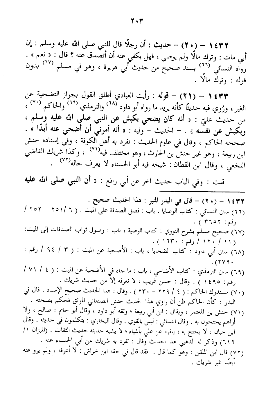1433 - (21) - قَوْلُهُ: رَأَيْت الْعَبَّادِيَّ أَطْلَقَ الْقَوْلَ بِجَوَازِ التَّضْحِيَةِ عَنْ الْغَيْرِ، وَرُوِيَ فِيهِ حَدِيثٌ كَأَنَّهُ يُرِيدُ مَا رَوَاهُ أَبُو دَاوُد وَالتِّرْمِذِيُّ وَالْحَاكِمُ، مِنْ حَدِيثِ عَلِيٍّ: " أَنَّهُ كَانَ يُضَحِّي بِكَبْشٍ عَنْ النَّبِيِّ - صَلَّى اللَّهُ عَلَيْهِ وَسَلَّمَ -، وَبِكَبْشٍ عَنْ نَفْسِهِ ". - الْحَدِيثَ - وَفِيهِ: «أَنَّهُ أَمَرَنِي أَنْ أُضَحِّيَ عَنْهُ أَبَدًا» . صَحَّحَهُ الْحَاكِمُ، وَقَالَ فِي عُلُومِ الْحَدِيثِ: تَفَرَّدَ بِهِ أَهْلُ الْكُوفَةِ، وَفِي إسْنَادِهِ حَنَشُ بْنُ رَبِيعَةَ، وَهُوَ غَيْرُ حَنَشِ بْنِ الْحَارِثِ، وَهُوَ مُخْتَلَفٌ فِيهِ، وَكَذَا شَرِيكٌ الْقَاضِي النَّخَعِيُّ، وَقَالَ ابْنُ الْقَطَّانِ: شَيْخُهُ فِيهِ أَبُو الْحَسْنَاءِ لَا يُعْرَفُ حَالُهُ. قُلْت: وَفِي الْبَابِ حَدِيثٌ آخَرُ عَنْ أَبِي رَافِعٍ: «أَنَّ النَّبِيَّ - صَلَّى اللَّهُ عَلَيْهِ وَسَلَّمَ -