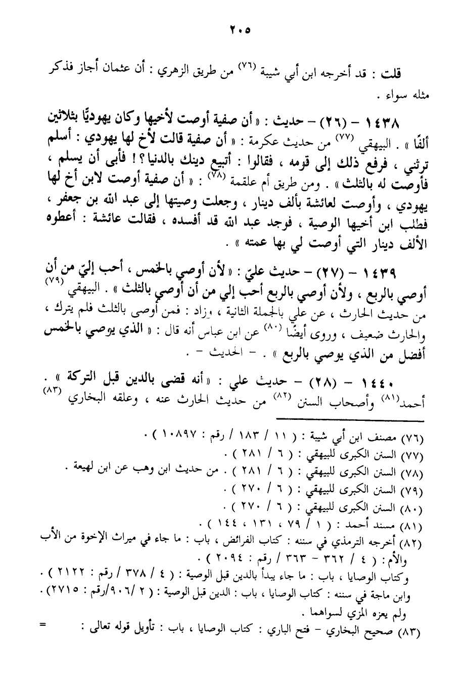 1438 - (26) - حَدِيثُ: " أَنَّ صَفِيَّةَ أَوْصَتْ لِأَخِيهَا وَكَانَ يَهُودِيًّا بِثَلَاثِينَ أَلْفًا. الْبَيْهَقِيّ مِنْ حَدِيثِ عِكْرِمَةَ: " أَنَّ صَفِيَّةَ قَالَتْ لِأَخٍ لَهَا يَهُودِيٍّ: أَسْلِمْ تَرِثْنِي، فَرَفَعَ ذَلِكَ إلَى قَوْمِهِ، فَقَالُوا: أَتَبِيعُ دِينَك بِالدُّنْيَا؟ ، فَأَبَى أَنْ يُسْلِمَ، فَأَوْصَتْ لَهُ بِالثُّلُثِ ". وَمِنْ طَرِيقِ أُمِّ عَلْقَمَةَ: " أَنَّ صَفِيَّةَ أَوْصَتْ لِابْنِ أَخٍ لَهَا يَهُودِيٍّ، وَأَوْصَتْ لِعَائِشَةَ بِأَلْفِ دِينَارٍ، وَجَعَلَتْ وَصِيَّتَهَا إلَى عَبْدِ اللَّهِ بْنِ جَعْفَرٍ، فَطَلَبَ ابْنُ أَخِيهَا الْوَصِيَّةَ، فَوَجَدَ عَبْدَ اللَّهِ قَدْ أَفْسَدَهُ، فَقَالَتْ عَائِشَةُ: أَعْطُوهُ الْأَلْفَ دِينَارٍ الَّتِي أَوْصَتْ لِي بِهَا عَمَّتُهُ "