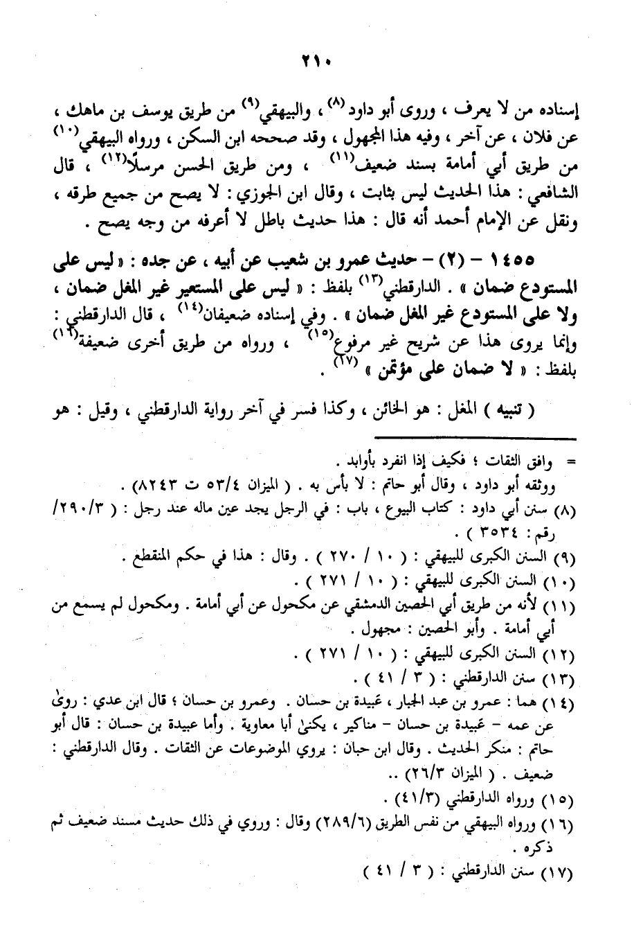 1455 - (2) - حَدِيثُ عَمْرِو بْنِ شُعَيْبٍ عَنْ أَبِيهِ، عَنْ جَدِّهِ: «لَيْسَ عَلَى الْمُسْتَوْدِعِ ضَمَانٌ» . الدَّارَقُطْنِيُّ بِلَفْظِ: «لَيْسَ عَلَى الْمُسْتَعِيرِ غَيْرِ الْمُغِلِّ ضَمَانٌ، وَلَا عَلَى الْمُسْتَوْدِعِ غَيْرِ الْمُغِلِّ ضَمَانٌ» . وَفِي إسْنَادِهِ ضَعِيفَانِ، قَالَ الدَّارَقُطْنِيُّ: وَإِنَّمَا يُرْوَى هَذَا عَنْ شُرَيْحٍ غَيْرَ مَرْفُوعٍ، وَرَوَاهُ مِنْ طَرِيقٍ أُخْرَى ضَعِيفَةٍ بِلَفْظِ: «لَا ضَمَانَ عَلَى مُؤْتَمَنٍ» .