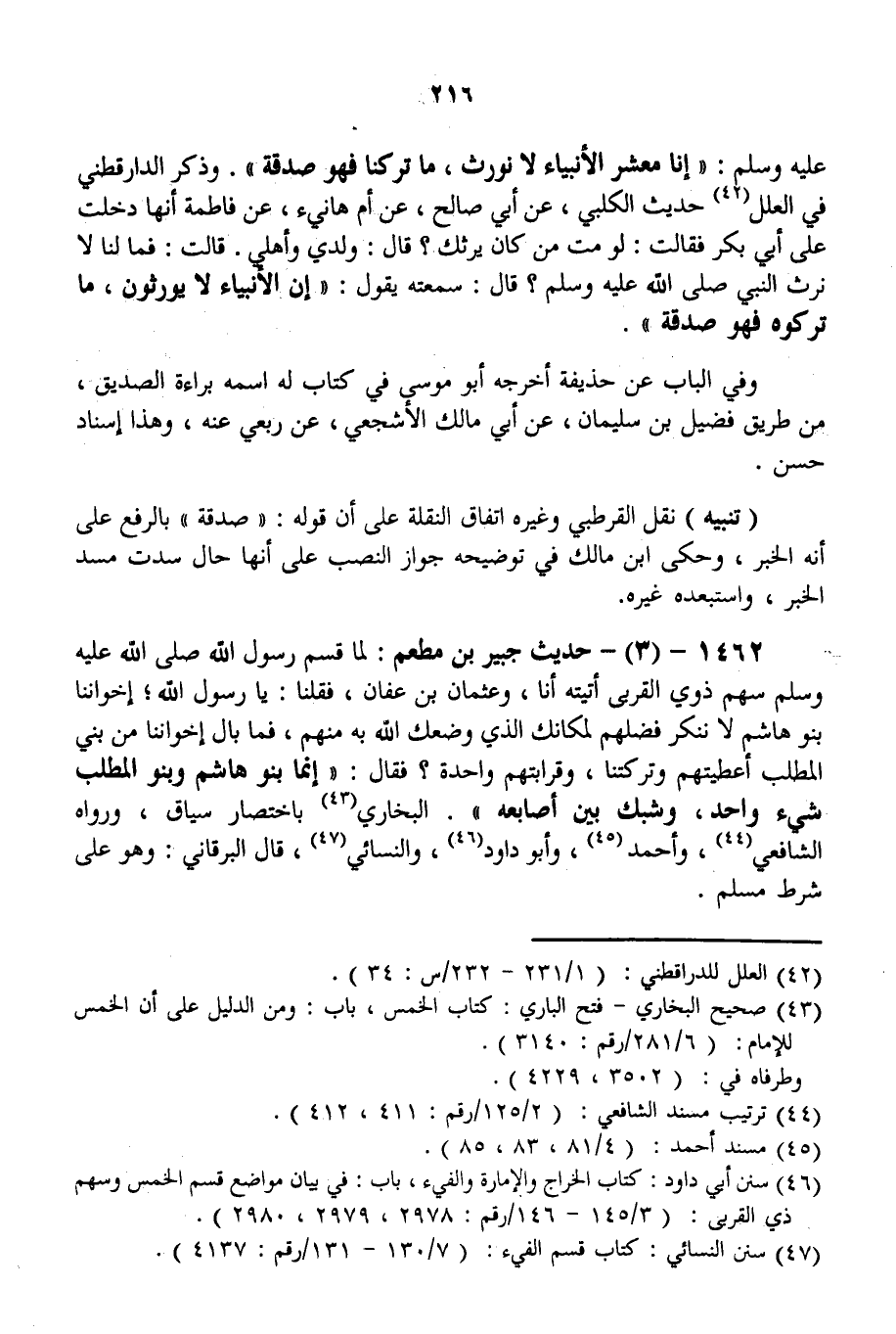 1462 - (3) - حَدِيثُ جُبَيْرِ بْنِ مُطْعِمٍ: «لَمَّا قَسَمَ رَسُولُ اللَّهِ - صَلَّى اللَّهُ عَلَيْهِ وَسَلَّمَ - سَهْمَ ذَوِي الْقُرْبَى أَتَيْته أَنَا وَعُثْمَانُ بْنُ عَفَّانَ، فَقُلْنَا: يَا رَسُولَ اللَّهِ؛ إخْوَانُنَا بَنُو هَاشِمٍ لَا نُنْكِرُ فَضْلَهُمْ لِمَكَانِك الَّذِي وَضَعَك اللَّهُ بِهِ مِنْهُمْ، فَمَا بَالُ إخْوَانِنَا مِنْ بَنِي الْمُطَّلِبِ أَعْطَيْتهمْ وَتَرَكْتنَا، وَقَرَابَتُهُمْ وَاحِدَةٌ؟ فَقَالَ: إنَّمَا بَنُو هَاشِمٍ وَبَنُو الْمُطَّلِبِ شَيْءٌ وَاحِدٌ، وَشَبَّكَ بَيْنَ أَصَابِعِهِ» . الْبُخَارِيُّ بِاخْتِصَارِ سِيَاقٍ، وَرَوَاهُ الشَّافِعِيُّ، وَأَحْمَدُ، وَأَبُو دَاوُد، وَالنَّسَائِيُّ، قَالَ الْبَرْقَانِيُّ: وَهُوَ عَلَى شَرْطِ مُسْلِمٍ.