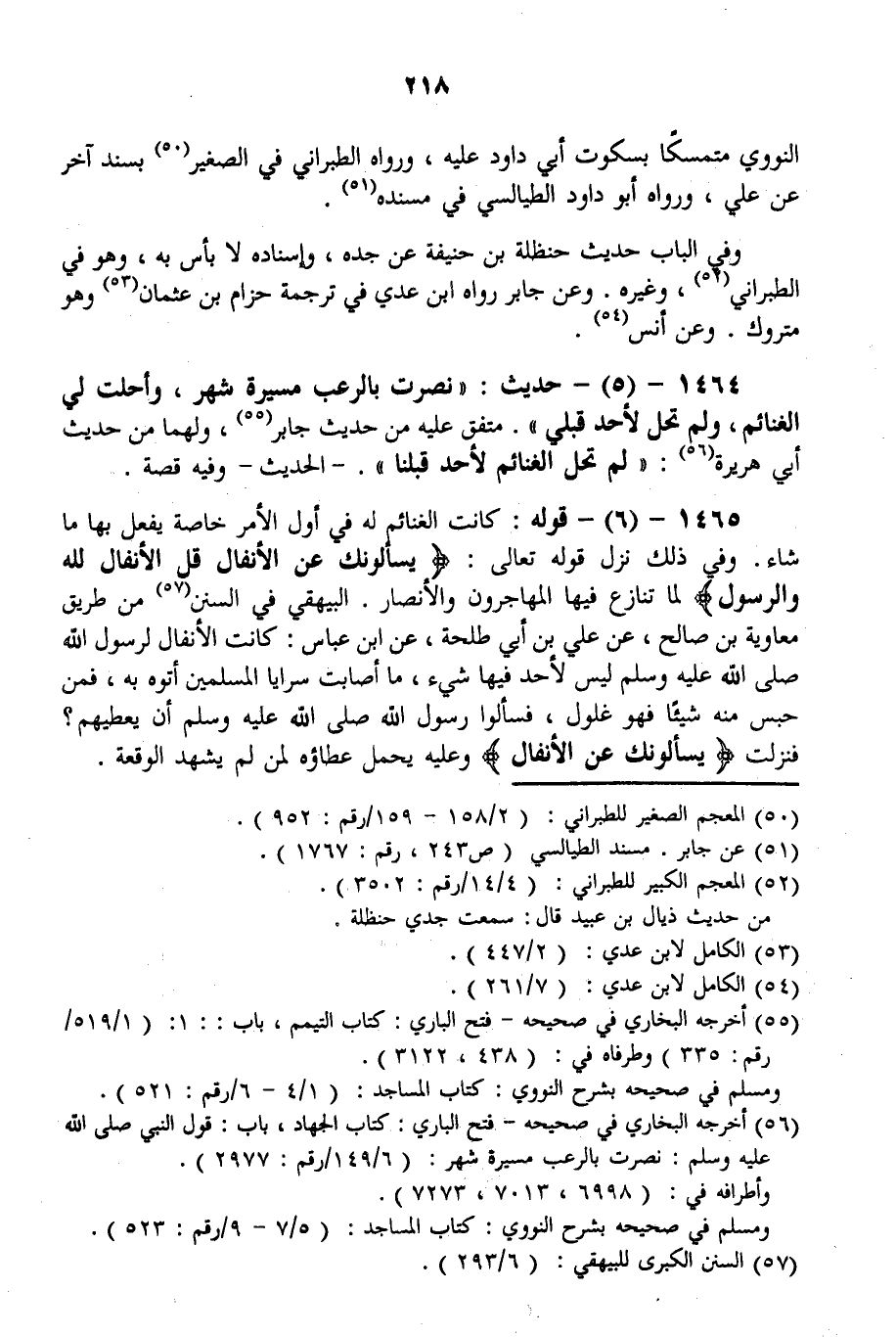 1464 - (5) - حَدِيثُ: «نُصِرْت بِالرُّعْبِ مَسِيرَةَ شَهْرٍ، وَأُحِلَّتْ لِي الْغَنَائِمُ، وَلَمْ تَحِلَّ لِأَحَدٍ قَبْلِي» . مُتَّفَقٌ عَلَيْهِ مِنْ حَدِيثِ جَابِرٍ، وَلَهُمَا مِنْ حَدِيثِ أَبِي هُرَيْرَةَ: «لَمْ تَحِلَّ الْغَنَائِمُ لِأَحَدٍ قَبْلَنَا» . - الْحَدِيثَ - وَفِيهِ قِصَّةٌ.