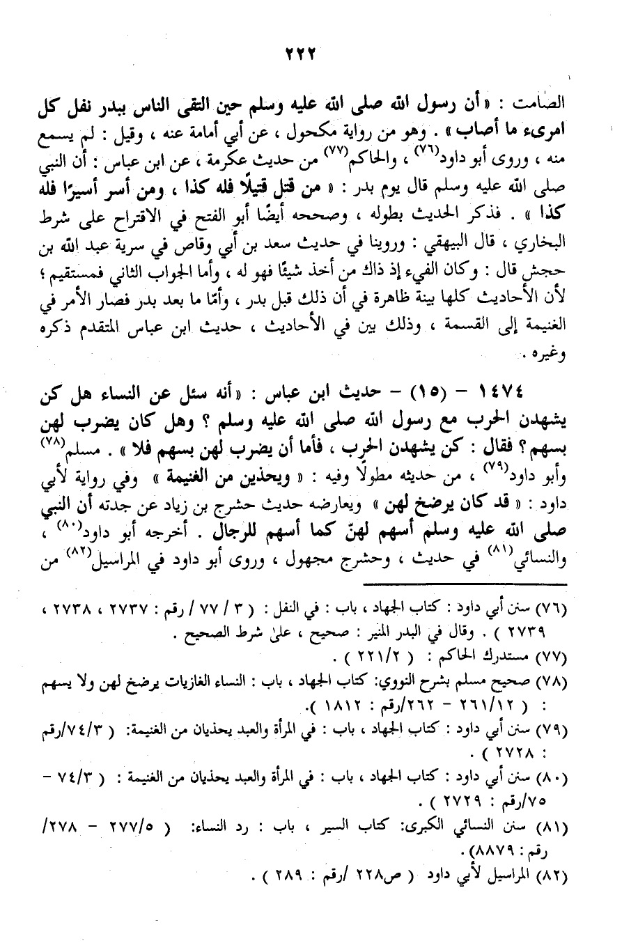 1474 - (15) - حَدِيثُ «ابْنِ عَبَّاسٍ: أَنَّهُ سُئِلَ عَنْ النِّسَاءِ هَلْ كُنَّ يَشْهَدْنَ الْحَرْبَ مَعَ رَسُولِ اللَّهِ - صَلَّى اللَّهُ عَلَيْهِ وَسَلَّمَ -؟ وَهَلْ كَانَ يُضْرَبُ لَهُنَّ بِسَهْمٍ؟ فَقَالَ: كُنَّ يَشْهَدْنَ الْحَرْبَ، فَأَمَّا أَنْ يُضْرَبَ لَهُنَّ بِسَهْمٍ فَلَا» . مُسْلِمٌ وَأَبُو دَاوُد، مِنْ حَدِيثِهِ مُطَوَّلًا وَفِيهِ: «وَيُحْذَيْنَ مِنْ الْغَنِيمَةِ» وَفِي رِوَايَةٍ لِأَبِي دَاوُد: «قَدْ كَانَ يُرْضَخُ لَهُنَّ» وَيُعَارِضُهُ حَدِيثُ حَشْرَجِ بْنِ زِيَادٍ عَنْ جَدَّتِهِ «أَنَّ النَّبِيَّ - صَلَّى اللَّهُ عَلَيْهِ وَسَلَّمَ - أَسْهَمَ لَهُنَّ كَمَا أَسْهَمَ لِلرِّجَالِ» . أَخْرَجَهُ أَبُو دَاوُد، وَالنَّسَائِيُّ فِي حَدِيثٍ، وَحَشْرَجٌ مَجْهُولٌ.