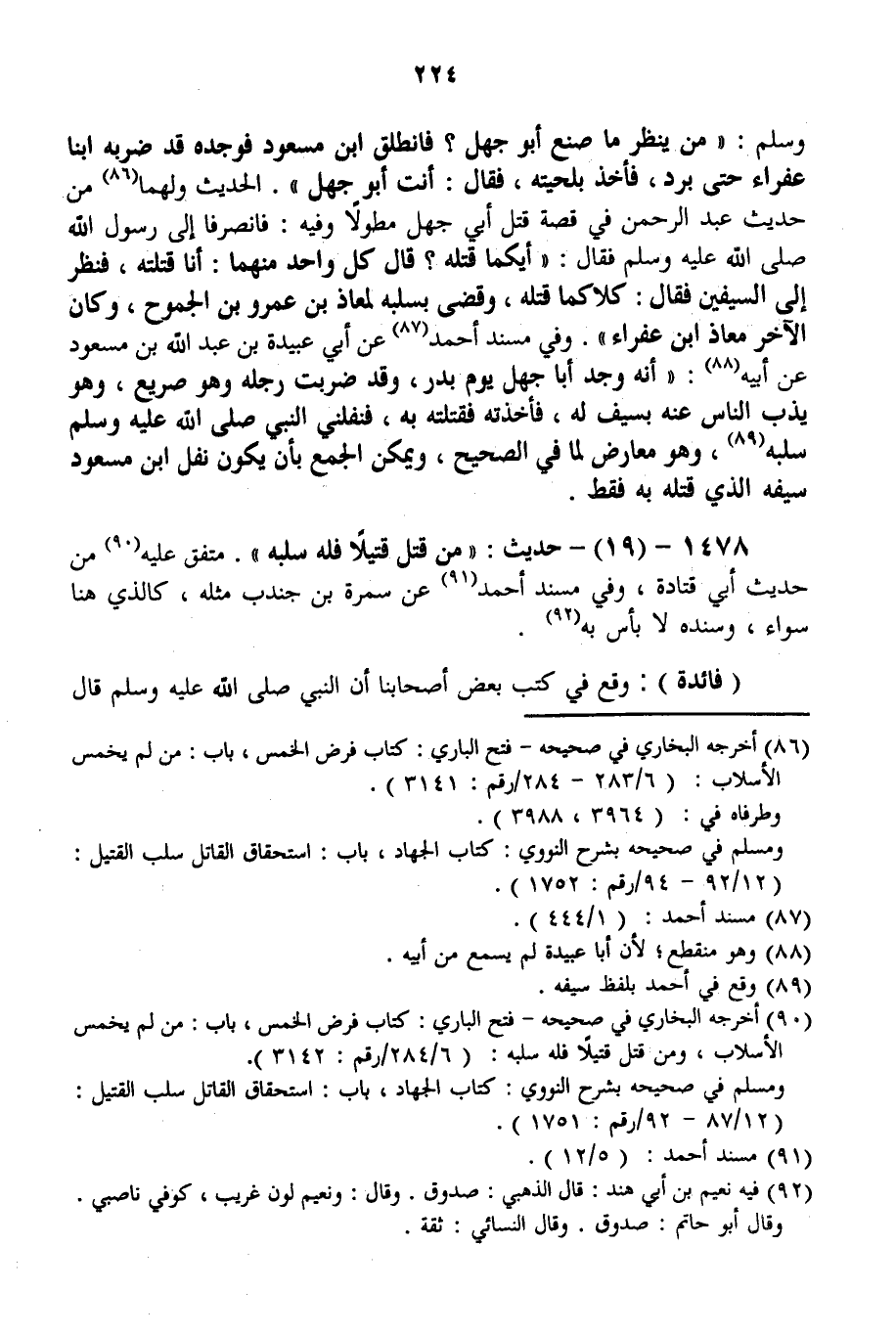 1478 - (19) - حَدِيثُ: «مَنْ قَتَلَ قَتِيلًا فَلَهُ سَلَبُهُ» . مُتَّفَقٌ عَلَيْهِ مِنْ حَدِيثِ أَبِي قَتَادَةَ، وَفِي مُسْنَدِ أَحْمَدَ عَنْ سَمُرَةَ بْنِ جُنْدُبٍ مِثْلُهُ، كَاَلَّذِي هُنَا سَوَاءٌ، وَسَنَدُهُ لَا بَأْسَ بِهِ.