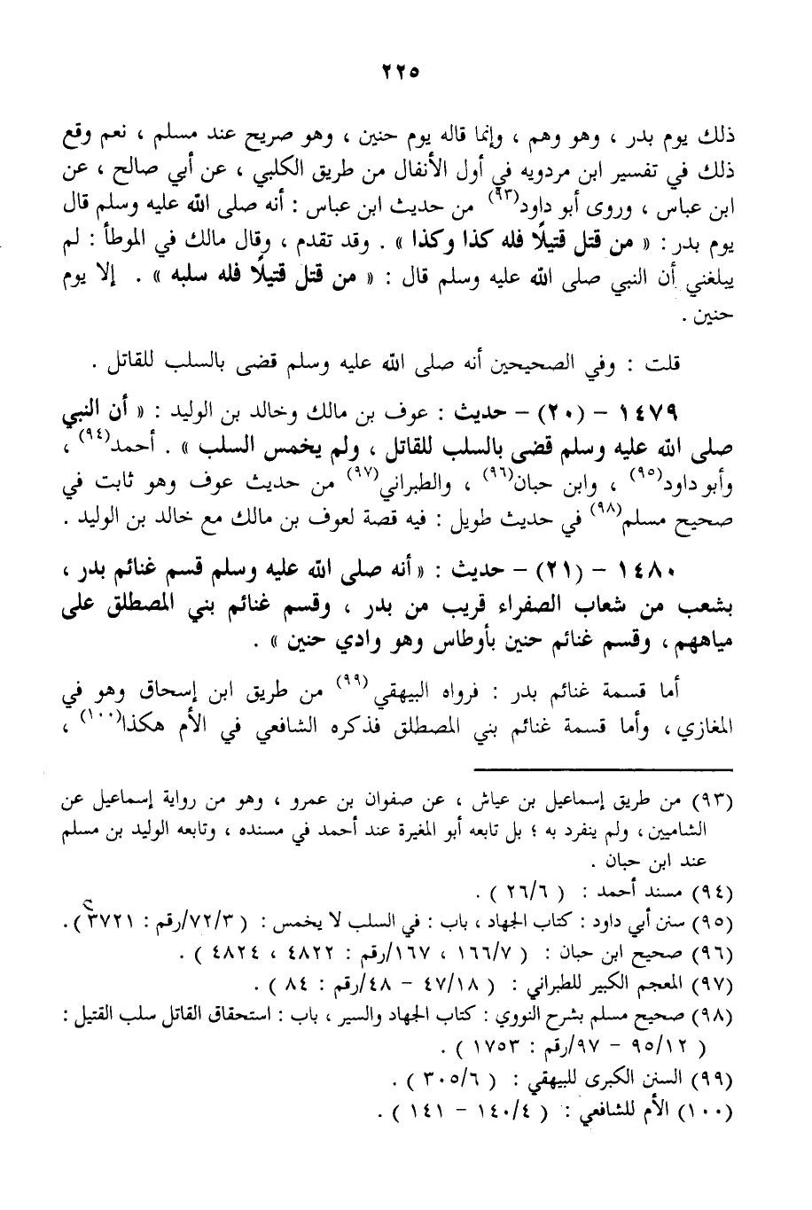 1479 - (20) - حَدِيثُ: عَوْفِ بْنِ مَالِكٍ وَخَالِدِ بْنِ الْوَلِيدِ: «أَنَّ النَّبِيَّ - صَلَّى اللَّهُ عَلَيْهِ وَسَلَّمَ - قَضَى بِالسَّلَبِ لِلْقَاتِلِ، وَلَمْ يُخَمِّسْ السَّلَبَ» . أَحْمَدُ، وَأَبُو دَاوُد، وَابْنُ حِبَّانَ، وَالطَّبَرَانِيُّ مِنْ حَدِيثِ عَوْفٍ وَهُوَ ثَابِتٌ فِي صَحِيحِ مُسْلِمٍ فِي حَدِيثٍ طَوِيلٍ: فِيهِ قِصَّةٌ لِعَوْفِ بْنِ مَالِكٍ مَعَ خَالِدِ بْنِ الْوَلِيدِ.