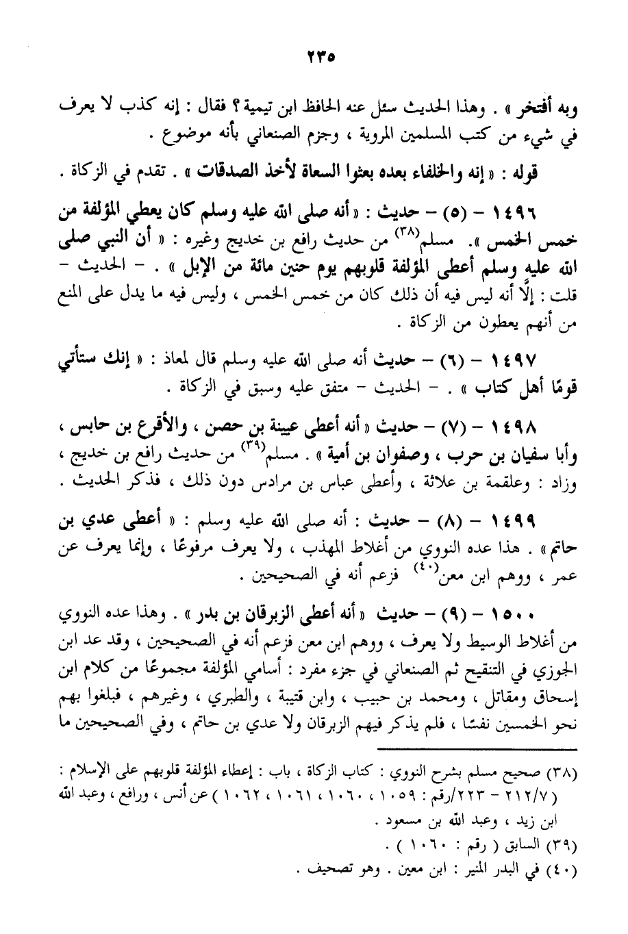 1500 - (9) - حَدِيثُ «أَنَّهُ أَعْطَى الزِّبْرِقَانَ بْنَ بَدْرٍ» . وَهَذَا عَدَّهُ النَّوَوِيُّ مِنْ أَغْلَاطِ الْوَسِيطِ وَلَا يُعْرَفُ، وَوَهِمَ ابْنُ مَعْنٍ فَزَعَمَ أَنَّهُ فِي الصَّحِيحَيْنِ، وَقَدْ عَدَّ ابْنُ الْجَوْزِيِّ فِي التَّنْقِيحِ ثُمَّ الصَّنْعَانِيُّ فِي جُزْءٍ مُفْرَدٍ: أَسَامِيَ الْمُؤَلَّفَةِ مَجْمُوعًا مِنْ كَلَامِ ابْنِ إِسْحَاقَ وَمُقَاتِلٍ، وَمُحَمَّدِ بْنِ حَبِيبٍ، وَابْنِ قُتَيْبَةَ، وَالطَّبَرِيِّ، وَغَيْرِهِمْ، فَبَلَغُوا بِهِمْ نَحْوَ الْخَمْسِينَ نَفْسًا، فَلَمْ يُذْكَرْ فِيهِمْ الزِّبْرِقَانُ وَلَا عَدِيُّ بْنُ حَاتِمٍ، وَفِي الصَّحِيحَيْنِ مَا
