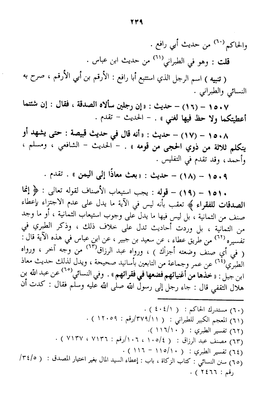 1510 - (19) - قَوْلُهُ: يَجِبُ اسْتِيعَابُ الْأَصْنَافِ لِقَوْلِهِ تَعَالَى: {إِنَّمَا الصَّدَقَاتُ لِلْفُقَرَاءِ} [التوبة: 60] تُعُقِّبَ بِأَنَّهُ لَيْسَ فِي الْآيَةِ مَا يَدُلُّ عَلَى عَدَمِ الِاجْتِزَاءِ بِإِعْطَاءِ صِنْفٍ مِنْ الثَّمَانِيَةِ، بَلْ لَيْسَ فِيهَا مَا يَدُلُّ عَلَى وُجُوبِ اسْتِيعَابِ الثَّمَانِيَةِ، أَوْ مَا وُجِدَ مِنْ الثَّمَانِيَةِ، بَلْ وَرَدَتْ أَحَادِيثُ تَدُلُّ عَلَى خِلَافِ ذَلِكَ، وَذَكَرَ الطَّبَرِيُّ فِي تَفْسِيرِهِ مِنْ طَرِيقِ عَطَاءٍ، عَنْ سَعِيدِ بْنِ جُبَيْرٍ، عَنْ ابْنِ عَبَّاسٍ فِي هَذِهِ الْآيَةِ قَالَ: (فِي أَيِّ صِنْفٍ وَضَعْتَهُ أَجْزَأَكَ) ، وَرَوَاهُ عَبْدُ الرَّزَّاقِ مِنْ وَجْهٍ آخَرَ، وَرَوَاهُ الطَّبَرِيُّ عَنْ عُمَرَ وَجَمَاعَةٍ مِنْ التَّابِعِينَ بِأَسَانِيدَ صَحِيحَةٍ، وَيَدُلُّ لِذَلِكَ حَدِيثُ مُعَاذِ بْنِ جَبَلٍ: «خُذْهَا مِنْ أَغْنِيَائِهِمْ فَضَعْهَا فِي فُقَرَائِهِمْ» . وَفِي النَّسَائِيّ عَنْ عَبْدِ اللَّهِ بْنِ هِلَالٍ الثَّقَفِيِّ قَالَ: «جَاءَ رَجُلٌ إلَى رَسُولِ اللَّهِ - صَلَّى اللَّهُ عَلَيْهِ وَسَلَّمَ - فَقَالَ: كِدْتُ أَنْ