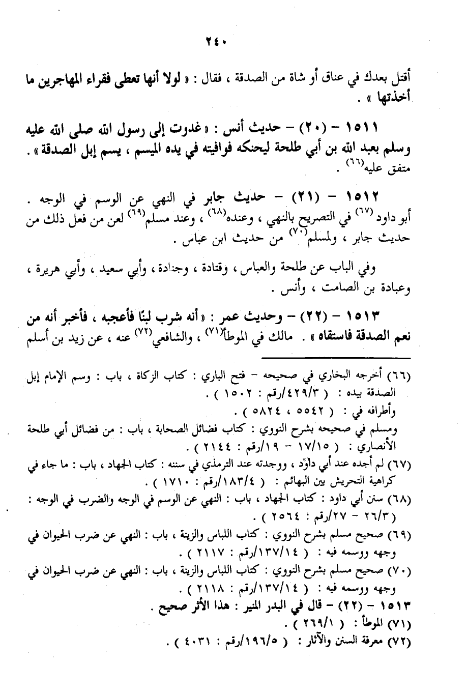 1511 - (20) - حَدِيثُ أَنَسٍ: «غَدَوْتُ إلَى رَسُولِ اللَّهِ - صَلَّى اللَّهُ عَلَيْهِ وَسَلَّمَ - بِعَبْدِ اللَّهِ بْنِ أَبِي طَلْحَةَ لِيُحَنِّكَهُ فَوَافَيْتُهُ فِي يَدِهِ الْمِيسَمُ، يَسِمُ إبِلَ الصَّدَقَةِ» . مُتَّفَقٌ عَلَيْهِ.