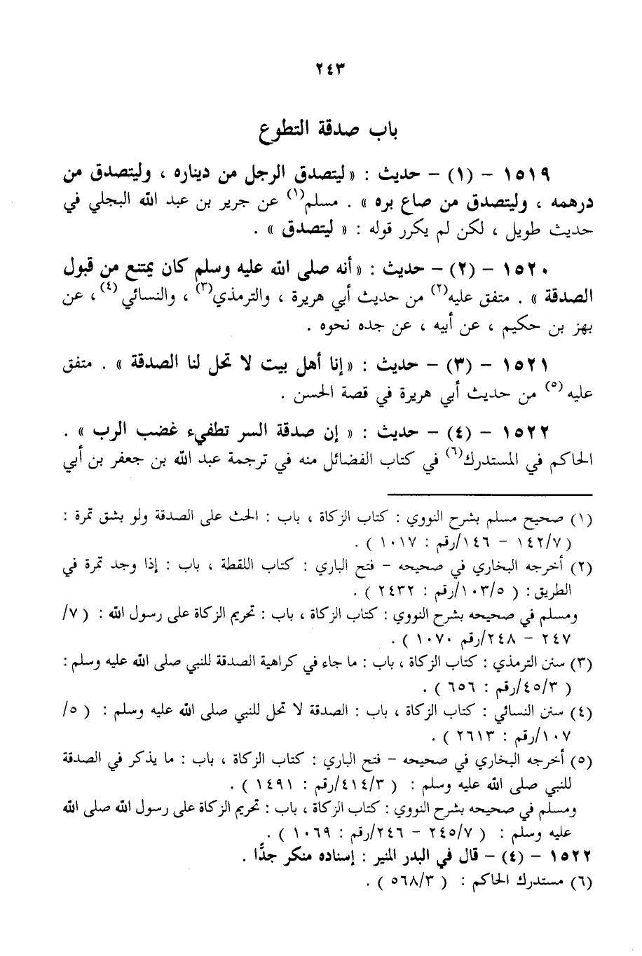 1520 - (2) - حَدِيثُ: «أَنَّهُ - صَلَّى اللَّهُ عَلَيْهِ وَسَلَّمَ - كَانَ يَمْتَنِعُ مِنْ قَبُولِ الصَّدَقَةِ» . مُتَّفَقٌ عَلَيْهِ مِنْ حَدِيثِ أَبِي هُرَيْرَةَ، وَالتِّرْمِذِيِّ وَالنَّسَائِيِّ، عَنْ بَهْزِ بْنِ حَكِيمٍ، عَنْ أَبِيهِ، عَنْ جَدِّهِ نَحْوَهُ. 50 1521 - (3) - حَدِيثُ: «إنَّا أَهْلُ بَيْتٍ لَا تَحِلُّ لَنَا الصَّدَقَةُ» . مُتَّفَقٌ عَلَيْهِ مِنْ حَدِيثِ أَبِي هُرَيْرَةَ فِي قِصَّةِ الْحَسَنِ.