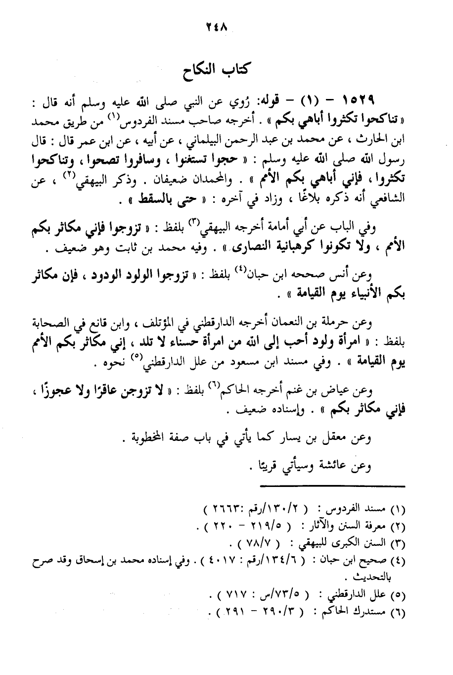 1529 - (1) - قَوْلُهُ: رُوِيَ عَنْ النَّبِيِّ - صَلَّى اللَّهُ عَلَيْهِ وَسَلَّمَ - أَنَّهُ قَالَ: «تَنَاكَحُوا تَكْثُرُوا أُبَاهِي بِكُمْ» . أَخْرَجَهُ صَاحِبُ مُسْنَدِ الْفِرْدَوْسِ مِنْ طَرِيقِ مُحَمَّدِ بْنِ الْحَارِثِ، عَنْ مُحَمَّدِ بْنِ عَبْدِ الرَّحْمَنِ الْبَيْلَمَانِيِّ، عَنْ أَبِيهِ، عَنْ ابْنِ عُمَرَ قَالَ. قَالَ رَسُولُ اللَّهِ - صَلَّى اللَّهُ عَلَيْهِ وَسَلَّمَ -: «حُجُّوا تَسْتَغْنُوا، وَسَافِرُوا تَصِحُّوا، وَتَنَاكَحُوا تَكْثُرُوا، فَإِنِّي أُبَاهِي بِكُمْ الْأُمَمَ» . وَالْمُحَمَّدَانِ ضَعِيفَانِ. وَذَكَرَ الْبَيْهَقِيُّ، عَنْ الشَّافِعِيِّ أَنَّهُ ذَكَرَهُ بَلَاغًا، وَزَادَ فِي آخِرِهِ: «حَتَّى بِالسَّقْطِ» .
