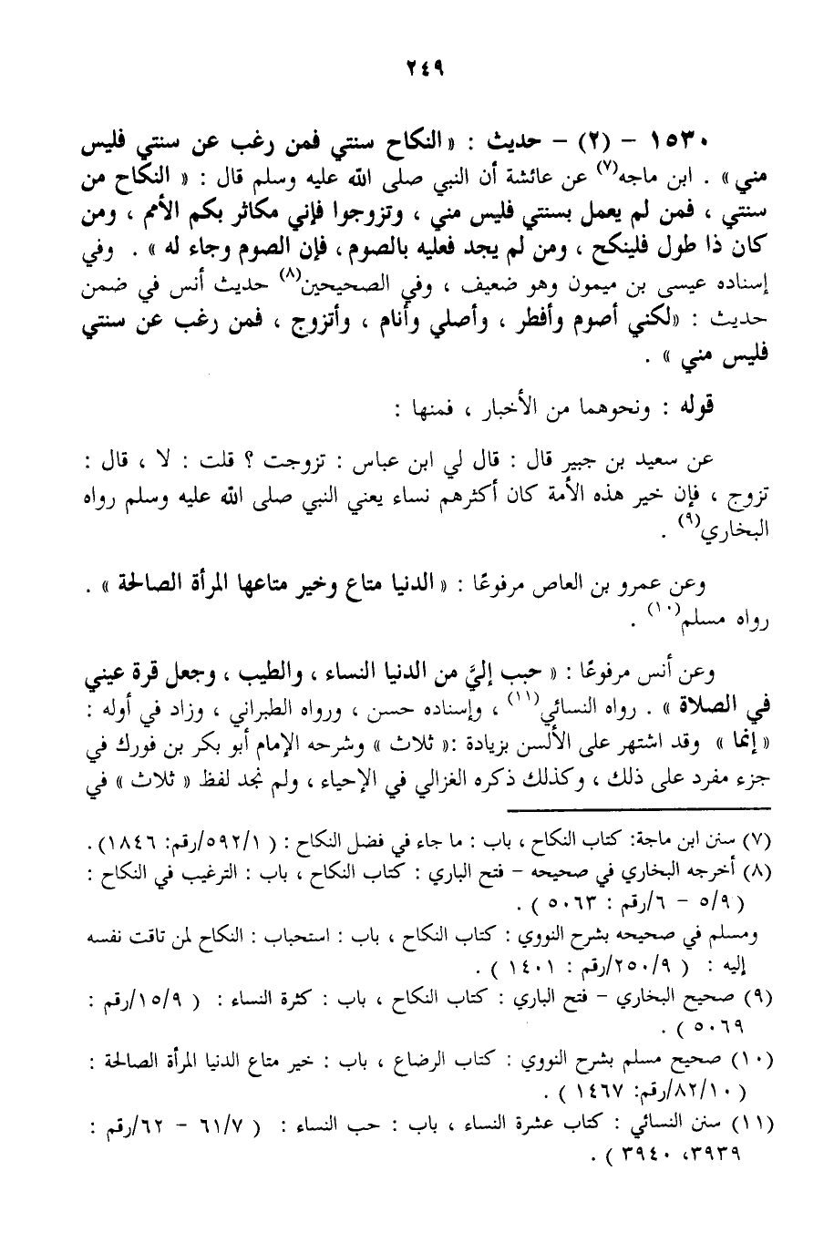50 - 1530 - (2) - حَدِيثُ: «النِّكَاحُ سُنَّتِي فَمَنْ رَغِبَ عَنْ سُنَّتِي فَلَيْسَ مِنِّي» . ابْنُ مَاجَهْ عَنْ عَائِشَةَ أَنَّ النَّبِيَّ - صَلَّى اللَّهُ عَلَيْهِ وَسَلَّمَ - قَالَ: «النِّكَاحُ مِنْ سُنَّتِي، فَمَنْ لَمْ يَعْمَلْ بِسُنَّتِي فَلَيْسَ مِنِّي، وَتَزَوَّجُوا فَإِنِّي مُكَاثِرٌ بِكُمْ الْأُمَمَ، وَمَنْ كَانَ ذَا طَوْلٍ فَلْيَنْكِحْ، وَمَنْ لَمْ يَجِدْ فَعَلَيْهِ بِالصَّوْمِ، فَإِنَّ الصَّوْمَ وِجَاءٌ لَهُ» . وَفِي إسْنَادِهِ عِيسَى بْنُ مَيْمُونٍ وَهُوَ ضَعِيفٌ، وَفِي الصَّحِيحَيْنِ حَدِيثُ أَنَسٍ فِي ضِمْنِ حَدِيثِ: «لَكِنِّي أَصُومُ وَأُفْطِرُ، وَأُصَلِّي وَأَنَامُ، وَأَتَزَوَّجُ، فَمَنْ رَغِبَ عَنْ سُنَّتِي فَلَيْسَ مِنِّي» . قَوْلُهُ: وَنَحْوُهُمَا مِنْ الْأَخْبَارِ، فَمِنْهَا: عَنْ سَعِيدِ بْنِ جُبَيْرٍ قَالَ: قَالَ لِي ابْنُ عَبَّاسٍ: تَزَوَّجْت؟ قُلْتُ: لَا، قَالَ: تَزَوَّجْ، فَإِنَّ خَيْرَ هَذِهِ الْأُمَّةِ كَانَ أَكْثَرَهُمْ نِسَاءً يَعْنِي النَّبِيَّ - صَلَّى اللَّهُ عَلَيْهِ وَسَلَّمَ - رَوَاهُ الْبُخَارِيُّ. وَعَنْ عَمْرِو بْنِ الْعَاصِ مَرْفُوعًا: «الدُّنْيَا مَتَاعٌ وَخَيْرُ مَتَاعِهَا الْمَرْأَةُ الصَّالِحَةُ» . رَوَاهُ مُسْلِمٌ. وَعَنْ أَنَسٍ مَرْفُوعًا: «حُبِّبَ إلَيَّ مِنْ الدُّنْيَا النِّسَاءُ، وَالطِّيبُ، وَجُعِلَ قُرَّةُ عَيْنِي فِي الصَّلَاةِ» . رَوَاهُ النَّسَائِيُّ، وَإِسْنَادُهُ حَسَنٌ، وَرَوَاهُ الطَّبَرَانِيُّ، وَزَادَ فِي أَوَّلِهِ: " إنَّمَا " وَقَدْ اُشْتُهِرَ عَلَى الْأَلْسُنِ بِزِيَادَةِ: " ثَلَاثٌ " وَشَرَحَهُ الْإِمَامُ أَبُو بَكْرِ بْنُ فُورَكٍ فِي جُزْءٍ مُفْرَدٍ عَلَى ذَلِكَ، وَكَذَلِكَ ذَكَرَهُ الْغَزَالِيُّ فِي الْإِحْيَاءِ، وَلَمْ نَجِدْ لَفْظَ " ثَلَاثٌ " فِي