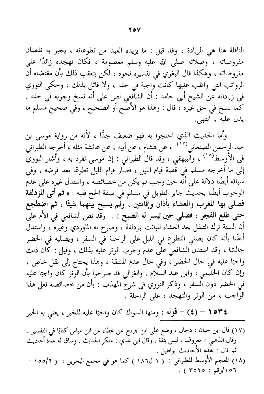 1534 - (4) - قَوْلُهُ: وَمِنْهَا السِّوَاكُ كَانَ وَاجِبًا عَلَيْهِ لِلْخَبَرِ، يَعْنِي بِهِ الْخَبَرَ