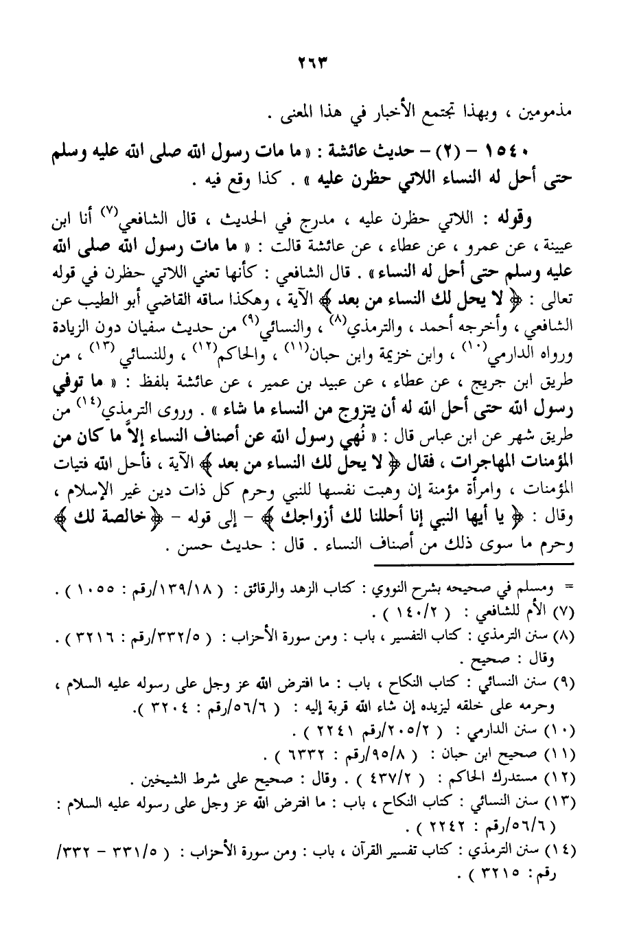 1540 - (2) - حَدِيثُ عَائِشَةَ: «مَا مَاتَ رَسُولُ اللَّهِ - صَلَّى اللَّهُ عَلَيْهِ وَسَلَّمَ - حَتَّى أُحِلَّ لَهُ النِّسَاءُ اللَّاتِي حُظِرْنَ عَلَيْهِ» . كَذَا وَقَعَ فِيهِ. وَقَوْلُهُ: اللَّاتِي حُظِرْنَ عَلَيْهِ، مُدْرَجٌ فِي الْحَدِيثِ، قَالَ الشَّافِعِيُّ أَنَا ابْنُ عُيَيْنَةَ، عَنْ عَمْرٍو، عَنْ عَطَاءٍ، عَنْ عَائِشَةَ قَالَتْ: «مَا مَاتَ رَسُولُ اللَّهِ - صَلَّى اللَّهُ عَلَيْهِ وَسَلَّمَ - حَتَّى أُحِلَّ لَهُ النِّسَاءُ» . قَالَ الشَّافِعِيُّ: كَأَنَّهَا تَعْنِي اللَّاتِي حُظِرْنَ فِي قَوْله تَعَالَى: {لا يَحِلُّ لَكَ النِّسَاءُ مِنْ بَعْدُ} [الأحزاب: 52] الْآيَةَ، وَهَكَذَا سَاقَهُ الْقَاضِي أَبُو الطَّيِّبِ عَنْ الشَّافِعِيِّ، وَأَخْرَجَهُ أَحْمَدُ، وَالتِّرْمِذِيُّ، وَالنَّسَائِيُّ مِنْ حَدِيثِ سُفْيَانَ دُونَ الزِّيَادَةِ وَرَوَاهُ الدَّارِمِيُّ، وَابْنُ خُزَيْمَةَ وَابْنُ حِبَّانَ، وَالْحَاكِمُ، وَلِلنَّسَائِيِّ، مِنْ طَرِيقِ ابْنِ جُرَيْجٍ، عَنْ عَطَاءٍ، عَنْ عُبَيْدِ بْنِ عُمَيْرٍ، عَنْ عَائِشَةَ بِلَفْظِ: «مَا تُوُفِّيَ رَسُولُ اللَّهِ حَتَّى أَحَلَّ اللَّهُ لَهُ أَنْ يَتَزَوَّجَ مِنْ النِّسَاءِ مَا شَاءَ» .