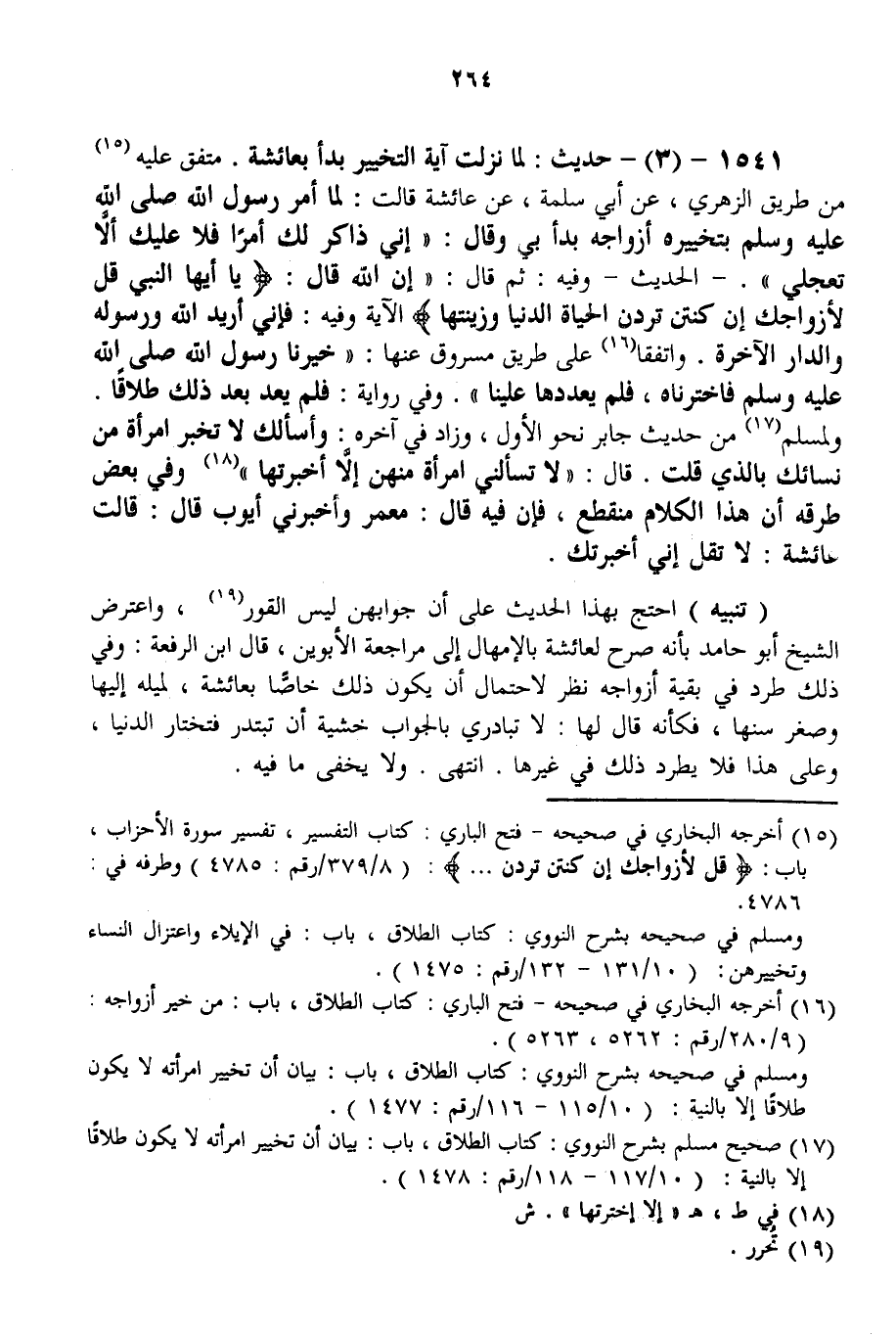 حَدِيثٌ: لَمَّا نَزَلَتْ آيَةُ التَّخْيِيرِ بَدَأَ بِعَائِشَةَ. مُتَّفَقٌ عَلَيْهِ مِنْ طَرِيقِ الزُّهْرِيِّ عَنْ أَبِي سَلَمَةَ، عَنْ عَائِشَةَ قَالَتْ: «لَمَّا أُمِرَ رَسُولُ اللَّهِ - صَلَّى اللَّهُ عَلَيْهِ وَسَلَّمَ - بِتَخْيِيرِهِ أَزْوَاجَهُ بَدَأَ بِي وَقَالَ: إنِّي ذَاكِرٌ لَكِ أَمْرًا فَلَا عَلَيْكِ أَلَّا تَعْجَلِي» . - الْحَدِيثَ - وَفِيهِ: ثُمَّ قَالَ: «إنَّ اللَّهَ قَالَ: {يَا أَيُّهَا النَّبِيُّ قُلْ لأَزْوَاجِكَ إِنْ كُنْتُنَّ تُرِدْنَ الْحَيَاةَ الدُّنْيَا وَزِينَتَهَا} [الأحزاب: 28] الْآيَةَ» وَفِيهِ: «فَإِنِّي أُرِيدُ اللَّهَ وَرَسُولَهُ وَالدَّارَ الْآخِرَةَ» . وَاتَّفَقَا عَلَى طَرِيقِ مَسْرُوقٍ عَنْهَا: «خَيَّرَنَا رَسُولُ اللَّهِ - صَلَّى اللَّهُ عَلَيْهِ وَسَلَّمَ - فَاخْتَرْنَاهُ، فَلَمْ يَعْدُدْهَا عَلَيْنَا» . وَفِي رِوَايَةٍ: فَلَمْ يَعُدَّ بَعْدَ ذَلِكَ طَلَاقًا. وَلِمُسْلِمٍ مِنْ حَدِيثِ جَابِرٍ نَحْوُ الْأَوَّلِ، وَزَادَ فِي آخِرِهِ: «وَأَسْأَلُكَ لَا تُخْبِرُ امْرَأَةً مِنْ نِسَائِكَ بِاَلَّذِي قُلْتُ. قَالَ: لَا تَسْأَلُنِي امْرَأَةٌ مِنْهُنَّ إلَّا أَخْبَرْتُهَا» وَفِي بَعْضِ طُرُقِهِ أَنَّ هَذَا الْكَلَامَ مُنْقَطِعٌ، فَإِنَّ فِيهِ قَالَ: مَعْمَرٌ وَأَخْبَرَنِي أَيُّوبُ قَالَ: قَالَتْ عَائِشَةُ: «لَا تَقُلْ إنِّي أَخْبَرْتُكَ» .