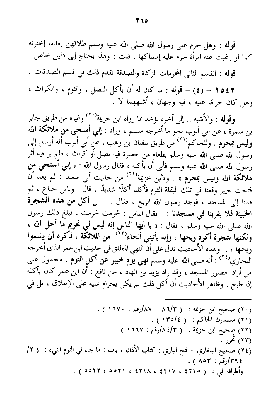 وَقَوْلُهُ: وَالْأَشْبَهُ. إلَى آخِرِهِ يُؤْخَذُ مِمَّا رَوَاهُ ابْنُ خُزَيْمَةَ وَغَيْرُهُ مِنْ طَرِيقِ جَابِرِ بْنِ سَمُرَةَ، عَنْ أَبِي أَيُّوبَ نَحْوُ مَا أَخْرَجَهُ مُسْلِمٌ، وَزَادَ: «إنِّي أَسْتَحِي مِنْ مَلَائِكَةِ اللَّهِ وَلَيْسَ بِمُحَرَّمٍ» . وَلِلْحَاكِمِ مِنْ طَرِيقِ سُفْيَانَ بْنِ وَهْبٍ، عَنْ أَبِي أَيُّوبَ أَنَّهُ «أُرْسِلَ إلَى رَسُولِ اللَّهِ - صَلَّى اللَّهُ عَلَيْهِ وَسَلَّمَ - بِطَعَامٍ مِنْ خَضِرَةٍ فِيهِ بَصَلٌ أَوْ كُرَّاثٌ، فَلَمْ يَرَ فِيهِ أَثَرَ رَسُولِ اللَّهِ - صَلَّى اللَّهُ عَلَيْهِ وَسَلَّمَ - فَأَبَى أَنْ يَأْكُلَهُ، فَقَالَ رَسُولُ اللَّهِ: إنِّي أَسْتَحِي مِنْ مَلَائِكَةِ اللَّهِ وَلَيْسَ بِمُحَرَّمٍ» . وَلِابْنِ خُزَيْمَةَ مِنْ حَدِيثِ أَبِي سَعِيدٍ: «لَمْ يَعُدْ أَنْ فُتِحَتْ خَيْبَرُ وَقَعْنَا فِي تِلْكَ الْبَقْلَةِ الثُّومِ فَأَكَلْنَا أَكْلًا شَدِيدًا، قَالَ: وَنَاسٌ جِيَاعٌ، ثُمَّ قُمْنَا إلَى الْمَسْجِدِ، فَوَجَدَ رَسُولُ اللَّهِ الرِّيحَ، فَقَالَ مَنْ أَكَلَ مِنْ هَذِهِ الشَّجَرَةِ الْخَبِيثَةِ فَلَا يَقْرَبْنَا فِي مَسْجِدِنَا. فَقَالَ النَّاسُ: حُرِّمَتْ حُرِّمَتْ، فَبَلَغَ ذَلِكَ رَسُولَ اللَّهِ - صَلَّى اللَّهُ عَلَيْهِ وَسَلَّمَ -، فَقَالَ: يَا أَيُّهَا النَّاسُ إنَّهُ لَيْسَ لِي تَحْرِيمُ مَا أَحَلَّ اللَّهُ، وَلَكِنَّهَا شَجَرَةٌ أَكْرَهُ رِيحَهَا، وَإِنَّهُ يَأْتِينِي أَنْحَاءٌ مِنْ الْمَلَائِكَةِ، فَأَكْرَهُ أَنْ يَشُمُّوا رِيحَهَا» . وَهَذِهِ الْأَحَادِيثُ تَدُلُّ عَلَى أَنَّ النَّهْيَ الْمُطْلَقَ فِي حَدِيثِ ابْنِ عُمَرَ الَّذِي أَخْرَجَهُ الْبُخَارِيُّ: «أَنَّهُ - صَلَّى اللَّهُ عَلَيْهِ وَسَلَّمَ - نَهَى يَوْمَ خَيْبَرَ عَنْ أَكْلِ الثُّومِ» مَحْمُولٌ عَلَى مَنْ أَرَادَ حُضُورَ الْمَسْجِدِ، وَقَدْ زَادَ يَزِيدُ بْنُ الْهَادِ، عَنْ نَافِعٍ: أَنَّ ابْنَ عُمَرَ كَانَ يَأْكُلُهُ إذَا طُبِخَ. وَظَاهِرُ الْأَحَادِيثِ أَنَّ أَكْلَ ذَلِكَ لَمْ يَكُنْ بِحَرَامٍ عَلَيْهِ عَلَى الْإِطْلَاقِ، بَلْ فِي