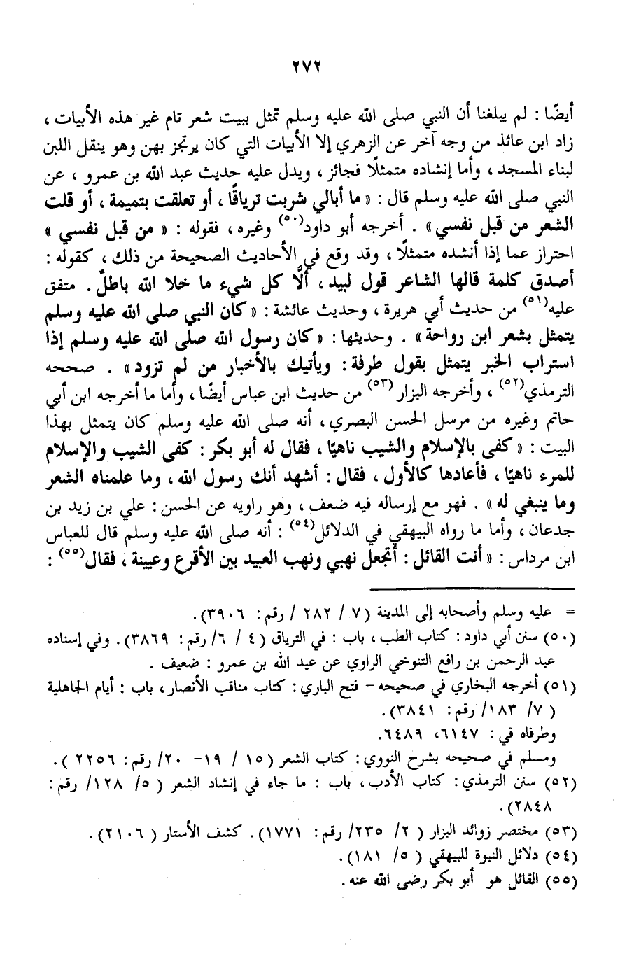 ، فَقَالَ لَهُ أَبُو بَكْرٍ: كَفَى الشَّيْبُ وَالْإِسْلَامُ لِلْمَرْءِ نَاهِيًا، فَأَعَادَهَا كَالْأَوَّلِ، فَقَالَ: أَشْهَدُ أَنَّك رَسُولُ اللَّهِ، وَمَا عَلَّمْنَاهُ الشِّعْرَ وَمَا يَنْبَغِي لَهُ» . فَهُوَ مَعَ إرْسَالِهِ فِيهِ ضَعْفٌ، وَهُوَ رَاوِيهِ عَنْ الْحَسَنِ: عَلِيُّ بْنُ زَيْدِ بْنِ جُدْعَانَ، وَأَمَّا مَا رَوَاهُ الْبَيْهَقِيُّ فِي الدَّلَائِلِ: «أَنَّهُ - صَلَّى اللَّهُ عَلَيْهِ وَسَلَّمَ - قَالَ لِلْعَبَّاسِ بْنِ مِرْدَاسٍ: أَنْتَ الْقَائِلُ: