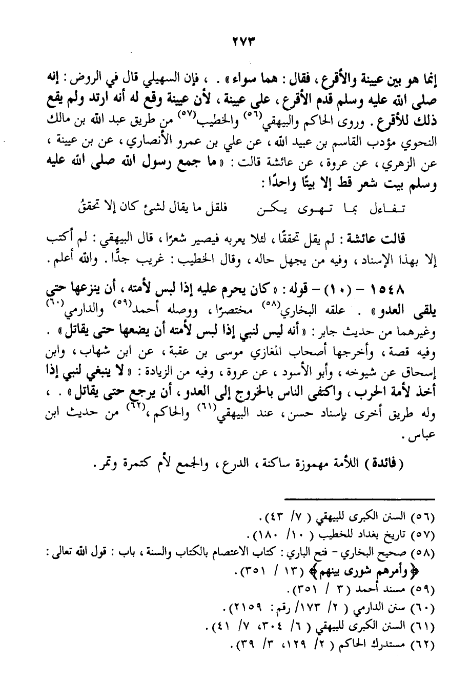 1548 - (10) - قَوْلُهُ: «كَانَ يَحْرُمُ عَلَيْهِ إذَا لَبِسَ لَأْمَتَهُ، أَنْ يَنْزِعَهَا حَتَّى يَلْقَى الْعَدُوَّ» . عَلَّقَهُ الْبُخَارِيُّ مُخْتَصَرًا، وَوَصَلَهُ أَحْمَدُ وَالدَّارِمِيُّ وَغَيْرُهُمَا مِنْ حَدِيثِ جَابِرٍ: «أَنَّهُ لَيْسَ لِنَبِيٍّ إذَا لَبِسَ لَأْمَتَهُ أَنْ يَضَعَهَا حَتَّى يُقَاتِلَ» .