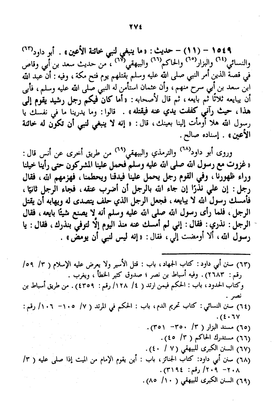 حَدِيثٌ: «مَا يَنْبَغِي لِنَبِيٍّ خَائِنَةُ الْأَعْيُنِ» . أَبُو دَاوُد وَالنَّسَائِيُّ وَالْبَزَّارُ وَالْحَاكِمُ وَالْبَيْهَقِيُّ، مِنْ حَدِيثِ سَعْدِ بْنِ أَبِي وَقَّاصٍ فِي قِصَّةِ الَّذِينَ أَمَرَ النَّبِيُّ - صَلَّى اللَّهُ عَلَيْهِ وَسَلَّمَ - بِقَتْلِهِمْ يَوْمَ فَتْحِ مَكَّةَ، وَفِيهِ: «أَنَّ عَبْدَ اللَّهِ بْنَ سَعْدِ بْنِ أَبِي سَرْحٍ مِنْهُمْ، وَأَنَّ عُثْمَانَ اسْتَأْمَنَ لَهُ النَّبِيَّ - صَلَّى اللَّهُ عَلَيْهِ وَسَلَّمَ -، فَأَبَى أَنْ يُبَايِعَهُ ثَلَاثًا ثُمَّ بَايَعَهُ، ثُمَّ قَالَ لِأَصْحَابِهِ: أَمَا كَانَ فِيكُمْ رَجُلٌ رَشِيدٌ يَقُومُ إلَى هَذَا، حَيْثُ رَآنِي كَفَفْت يَدَيَّ عَنْهُ فَيَقْتُلُهُ. قَالُوا: وَمَا يُدْرِينَا مَا فِي نَفْسِك يَا رَسُولَ اللَّهِ هَلَّا أَوْمَأْت إلَيْنَا بِعَيْنِك، قَالَ: إنَّهُ لَا يَنْبَغِي لِنَبِيٍّ أَنْ تَكُونَ لَهُ خَائِنَةُ الْأَعْيُنِ» . إسْنَادُهُ صَالِحٌ.