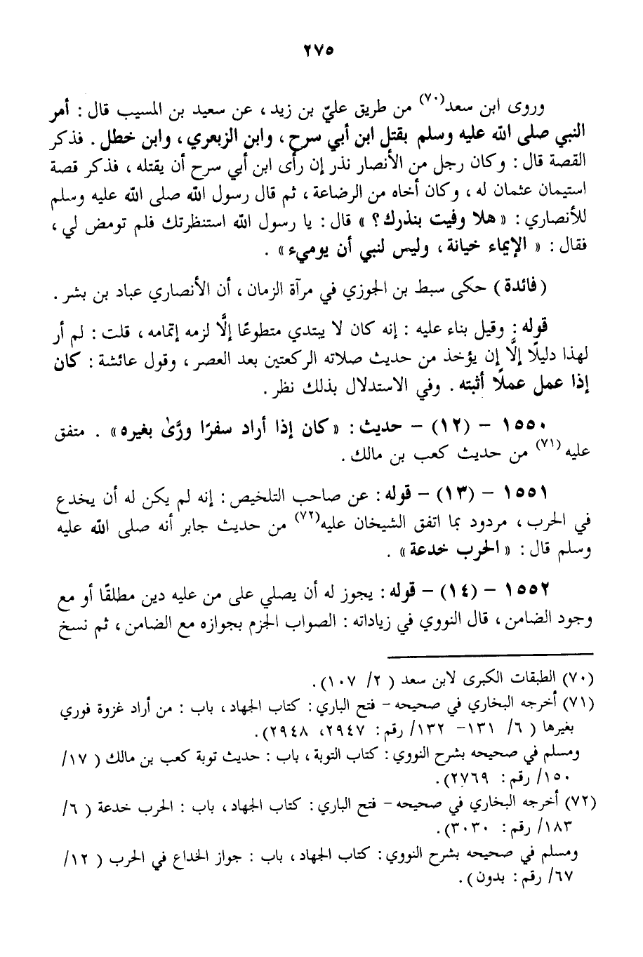 1551 - (13) - قَوْلُهُ: عَنْ صَاحِبِ التَّلْخِيصِ: إنَّهُ لَمْ يَكُنْ لَهُ أَنْ يَخْدَعَ فِي الْحَرْبِ، مَرْدُودٌ بِمَا اتَّفَقَ الشَّيْخَانِ عَلَيْهِ مِنْ حَدِيثِ جَابِرٍ أَنَّهُ - صَلَّى اللَّهُ عَلَيْهِ وَسَلَّمَ - قَالَ: «الْحَرْبُ خُدْعَةٌ» .
