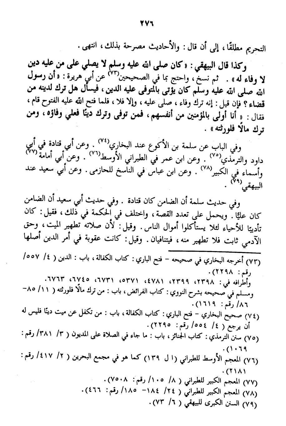 وَكَذَا قَالَ الْبَيْهَقِيُّ: «كَانَ - صَلَّى اللَّهُ عَلَيْهِ وَسَلَّمَ - لَا يُصَلِّي عَلَى مَنْ عَلَيْهِ دَيْنٌ لَا وَفَاءَ لَهُ» ثُمَّ نُسِخَ، وَاحْتَجَّ بِمَا فِي الصَّحِيحَيْنِ عَنْ أَبِي هُرَيْرَةَ: «أَنَّ رَسُولَ اللَّهِ - صَلَّى اللَّهُ عَلَيْهِ وَسَلَّمَ - كَانَ يُؤْتَى بِالْمُتَوَفَّى عَلَيْهِ الدَّيْنُ، فَيَسْأَلُ هَلْ تَرَكَ لِدَيْنِهِ مِنْ قَضَاءٍ؟ فَإِنْ قِيلَ: إنَّهُ تَرَكَ وَفَاءً، صَلَّى عَلَيْهِ، وَإِلَّا فَلَا، فَلَمَّا فَتَحَ اللَّهُ عَلَيْهِ الْفُتُوحَ قَامَ، فَقَالَ أَنَا أَوْلَى بِالْمُؤْمِنِينَ مِنْ أَنْفُسِهِمْ، فَمَنْ تُوُفِّيَ وَتَرَكَ دَيْنًا فَعَلَيَّ وَفَاؤُهُ، وَمَنْ تَرَكَ مَالًا فَلِوَرَثَتِهِ» .