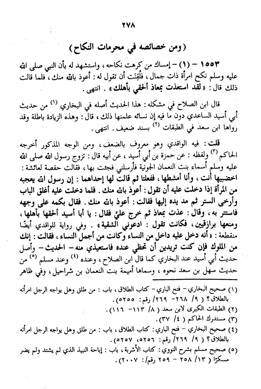 50 - 1553 - (1) - إمْسَاكُ مَنْ كَرِهَتْ نِكَاحَهُ، وَاسْتُشْهِدَ لَهُ بِأَنَّ النَّبِيَّ - صَلَّى اللَّهُ عَلَيْهِ وَسَلَّمَ - «نَكَحَ امْرَأَةً ذَاتَ جَمَالٍ، فَلُقِّنَتْ أَنْ تَقُولَ لَهُ: أَعُوذُ بِاَللَّهِ مِنْك، فَلَمَّا قَالَتْ ذَلِكَ قَالَ: لَقَدْ اسْتَعَذْتِ بِمَعَاذٍ الْحَقِي بِأَهْلِك» . انْتَهَى. قَالَ ابْنُ الصَّلَاحِ فِي مُشْكِلِهِ: هَذَا الْحَدِيثُ أَصْلُهُ فِي الْبُخَارِيِّ مِنْ حَدِيثِ أَبِي أُسَيْدٍ السَّاعِدِيِّ دُونَ مَا فِيهِ أَنَّ نِسَاءَهُ عَلَّمْنَهَا ذَلِكَ، قَالَ: وَهَذِهِ الزِّيَادَةُ بَاطِلَةٌ وَقَدْ رَوَاهَا ابْنُ سَعْدٍ فِي الطَّبَقَاتِ بِسَنَدٍ ضَعِيفٍ. انْتَهَى.