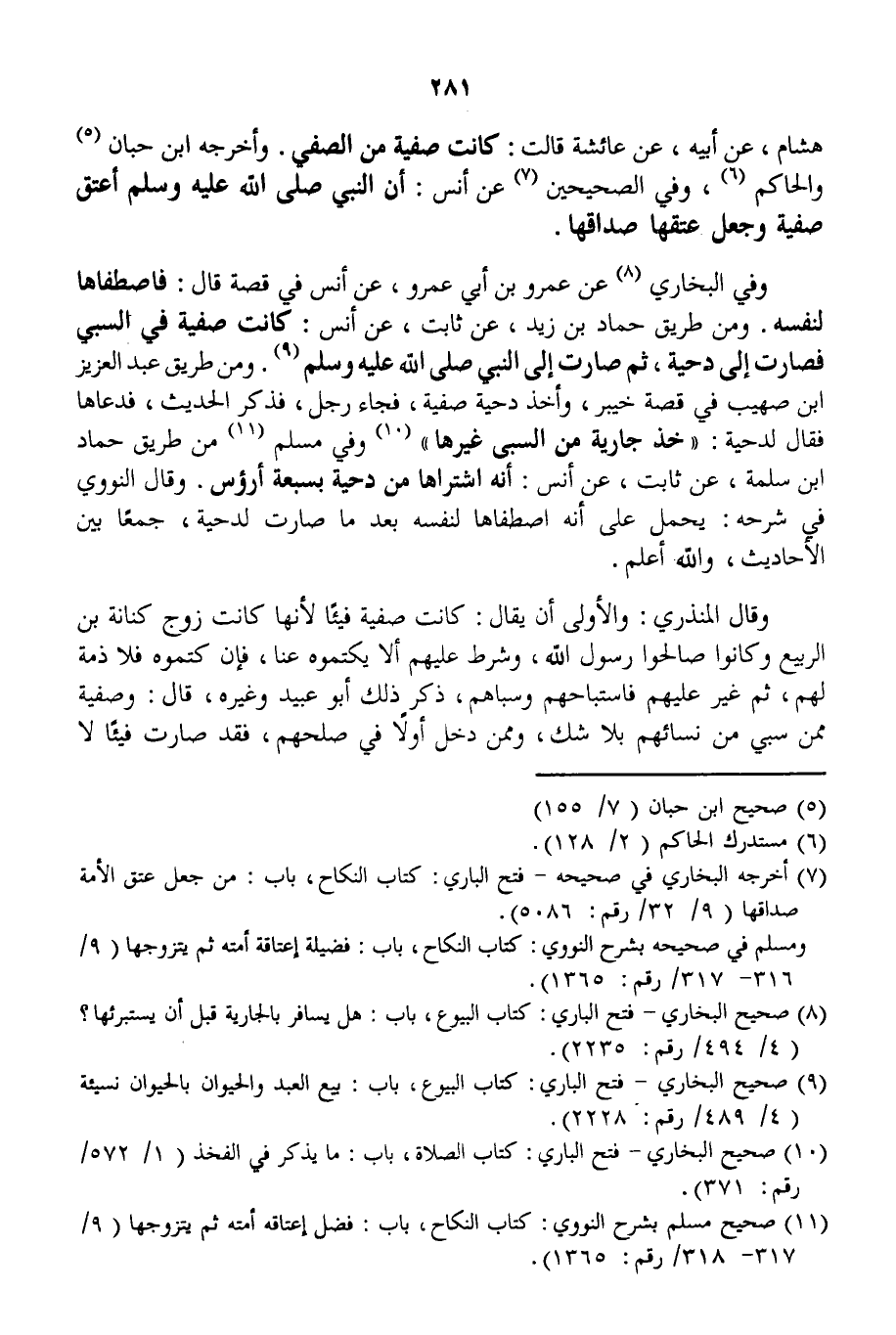 هِشَامٍ، عَنْ أَبِيهِ، عَنْ عَائِشَةَ قَالَتْ: كَانَتْ صَفِيَّةُ مِنْ الصَّفِيِّ. وَأَخْرَجَهُ ابْنُ حِبَّانَ وَالْحَاكِمُ، وَفِي الصَّحِيحَيْنِ عَنْ أَنَسٍ: «أَنَّ النَّبِيَّ - صَلَّى اللَّهُ عَلَيْهِ وَسَلَّمَ - أَعْتَقَ صَفِيَّةَ وَجَعَلَ عِتْقَهَا صَدَاقَهَا» . وَفِي الْبُخَارِيِّ عَنْ عَمْرِو بْنِ أَبِي عَمْرٍو، عَنْ أَنَسٍ فِي قِصَّةٍ قَالَ: «فَاصْطَفَاهَا لِنَفْسِهِ» . وَمِنْ طَرِيقِ حَمَّادِ بْنِ زَيْدٍ، عَنْ ثَابِتٍ، عَنْ أَنَسٍ: «كَانَتْ صَفِيَّةُ فِي السَّبْيِ فَصَارَتْ إلَى دِحْيَةَ، ثُمَّ صَارَتْ إلَى النَّبِيِّ - صَلَّى اللَّهُ عَلَيْهِ وَسَلَّمَ -» . وَمِنْ طَرِيقِ عَبْدِ الْعَزِيزِ بْنِ صُهَيْبٍ فِي قِصَّةِ خَيْبَرَ، وَأَخَذَ دِحْيَةُ صَفِيَّةَ، فَجَاءَ رَجُلٌ، فَذَكَرَ الْحَدِيثَ، «فَدَعَاهَا فَقَالَ لِدِحْيَةَ: خُذْ جَارِيَةً مِنْ السَّبْيِ غَيْرَهَا» وَفِي مُسْلِمٍ مِنْ طَرِيقِ حَمَّادِ بْنِ سَلَمَةَ، عَنْ ثَابِتٍ، عَنْ أَنَسٍ: «أَنَّهُ اشْتَرَاهَا مِنْ دِحْيَةَ بِسَبْعَةِ أَرْؤُسٍ» .