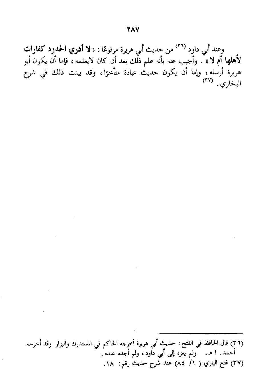 وَعِنْدَ أَبِي دَاوُد مِنْ حَدِيثِ أَبِي هُرَيْرَةَ مَرْفُوعًا: «لَا أَدْرِي الْحُدُودُ كَفَّارَاتٌ لِأَهْلِهَا أَمْ لَا» .