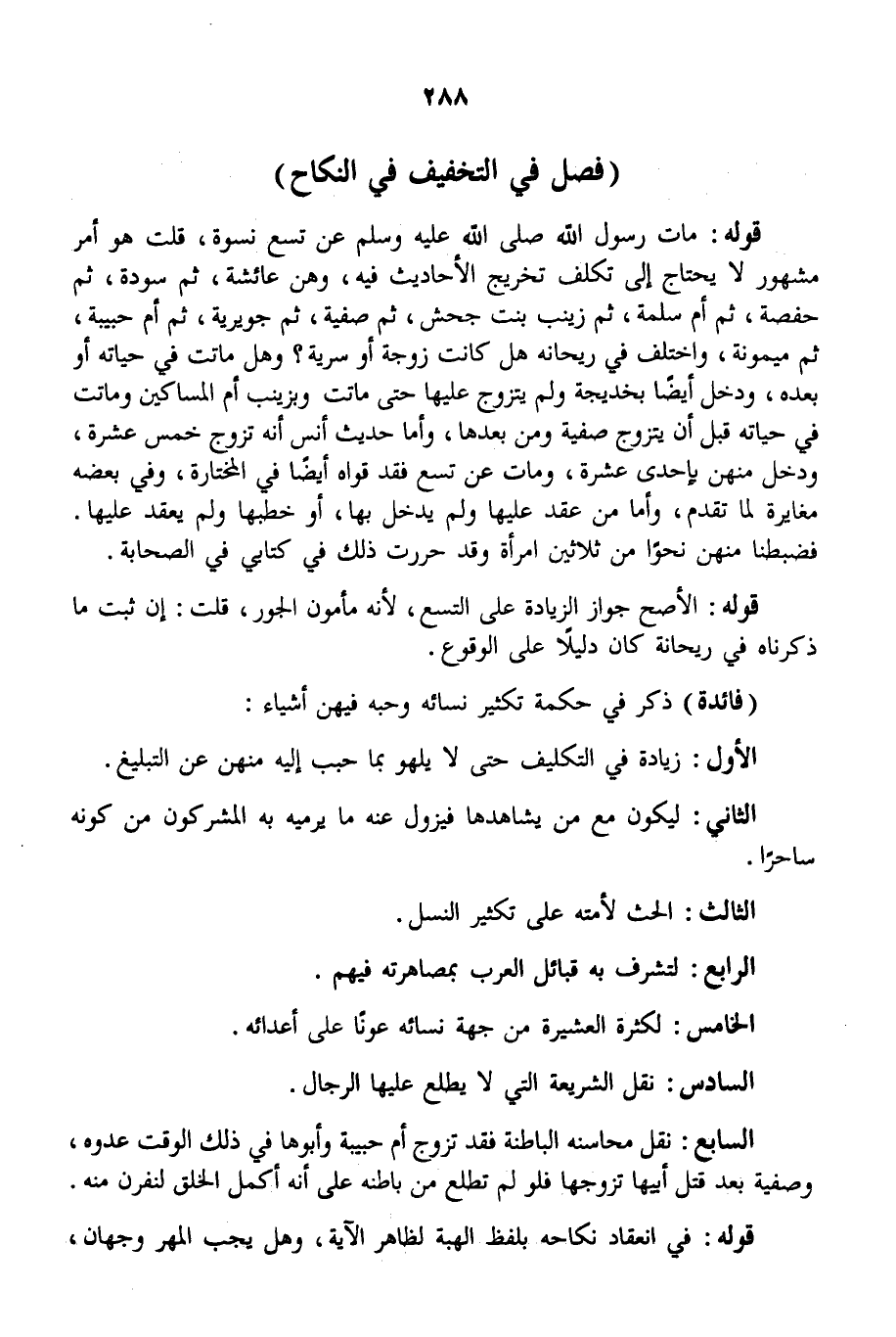 ذُكِرَ فِي حِكْمَةِ تَكْثِيرِ نِسَائِهِ وَحُبِّهِ فِيهِنَّ أَشْيَاءُ: الْأَوَّلُ: زِيَادَةٌ فِي التَّكْلِيفِ حَتَّى لَا يَلْهُوَ بِمَا حُبِّبَ إلَيْهِ مِنْهُنَّ عَنْ التَّبْلِيغِ. الثَّانِي: لِيَكُونَ مَعَ مَنْ يُشَاهِدُهَا فَيَزُولَ عَنْهُ مَا يَرْمِيهِ بِهِ الْمُشْرِكُونَ مِنْ كَوْنِهِ سَاحِرًا. الثَّالِثُ: الْحَثُّ لِأُمَّتِهِ عَلَى تَكْثِيرِ النَّسْلِ. الرَّابِعُ: لِتَشْرُفَ بِهِ قَبَائِلُ الْعَرَبِ بِمُصَاهَرَتِهِ فِيهِمْ. الْخَامِسُ: لِكَثْرَةِ الْعَشِيرَةِ مِنْ جِهَةِ نِسَائِهِ عَوْنًا عَلَى أَعْدَائِهِ. السَّادِسُ: نَقْلُ الشَّرِيعَةِ الَّتِي لَا يَطَّلِعُ عَلَيْهَا الرِّجَالُ. السَّابِعُ: نَقْلُ مَحَاسِنِهِ الْبَاطِنَةِ فَقَدْ تَزَوَّجَ أُمَّ حَبِيبَةَ وَأَبُوهَا فِي ذَلِكَ الْوَقْتِ عَدُوُّهُ، وَصْفِيَّةَ بَعْدَ قَتْلِ أَبِيهَا تَزَوَّجَهَا فَلَوْ لَمْ تَطَّلِعْ مِنْ بَاطِنِهِ عَلَى أَنَّهُ أَكْمَلُ الْخَلْقِ لَنَفَرْنَ مِنْهُ.